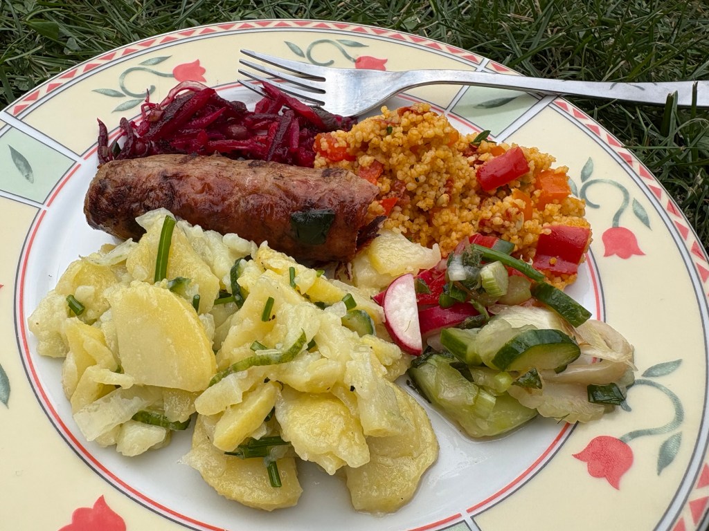 Irgendwo spielen Kinder mit ihren Tanten Karten, später springen sie in den Teich und plantschen. Nebenbei heizt der thüringische Teil der Familie schon den Grill an. Es wurden selbstverständliche echte Rostbratwürste mitgebracht, es gibt aber auch Fleisch und Vegetarisches, jede Menge Salate und frisch geräucherten Fisch. Die anwesenden Hunde (ein heimischer und mehrere Gasthunde) sind ganz aus dem Häuschen. Passend zum Essen gibt es jetzt auch Bier vom Fass, Erdbeerbowle mit und ohne Alkohol und später am Abend auch stärkere Getränke.