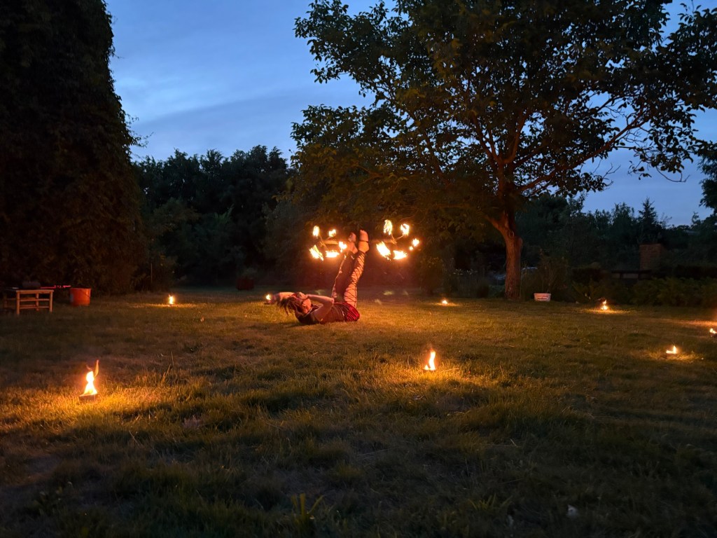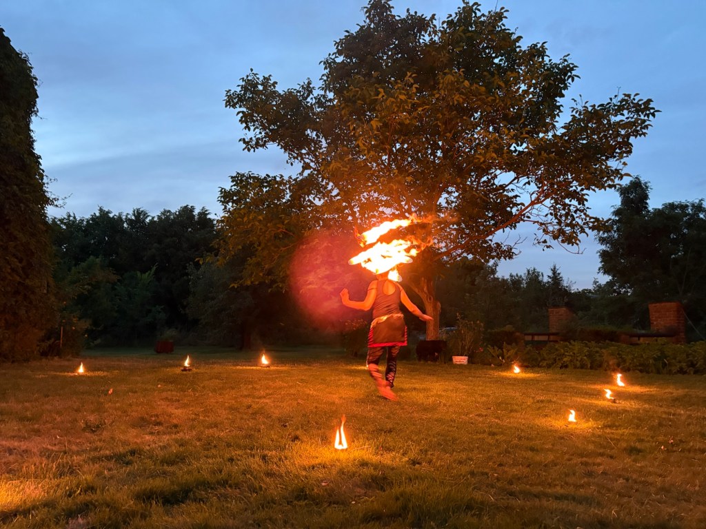 Als es dunkel wird, gibt es eine von drei Familienmitgliedern vorbereitete Feuershow, die in einem Feuerwerk und anschließendem Tanz kulminiert.