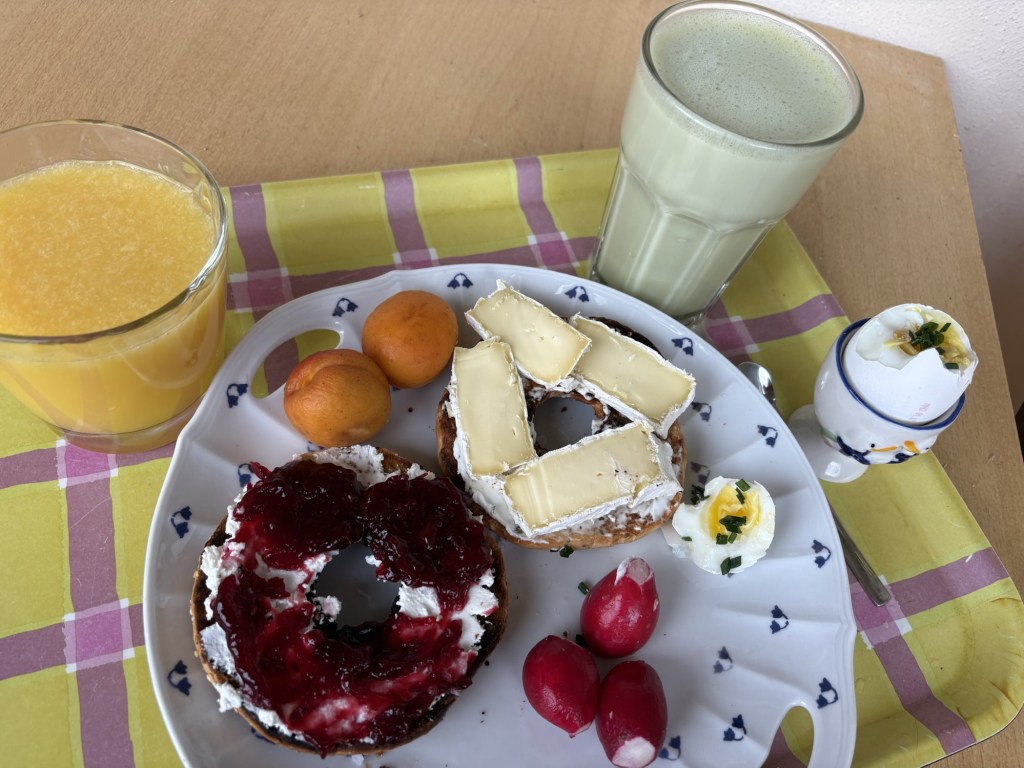 Mit blank gewienerten Beißerchen fahre ich ein paar Stationen in der Partytram und lande im Mauerpark. Ich laufe einmal fast durch und suche mir dann im Birkenwäldchen eine Bank zum Lesen. Von meinem Bücherstapel ist jetzt endlich Susanne Mieraus Füreinander Sorgen: Warum unsere Gesellschaft ein neues Miteinander braucht dran. Bald darauf fängt es allerdings an zu regnen, so dass ich in ein Café in der Nähe wechsle und dort bei sehr schöner Musik und einer Rhabarberschorle mit Minze weiterlese, bis es Zeit wird, zur Physio aufzubrechen.