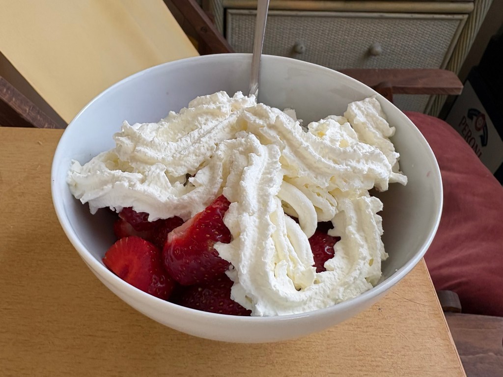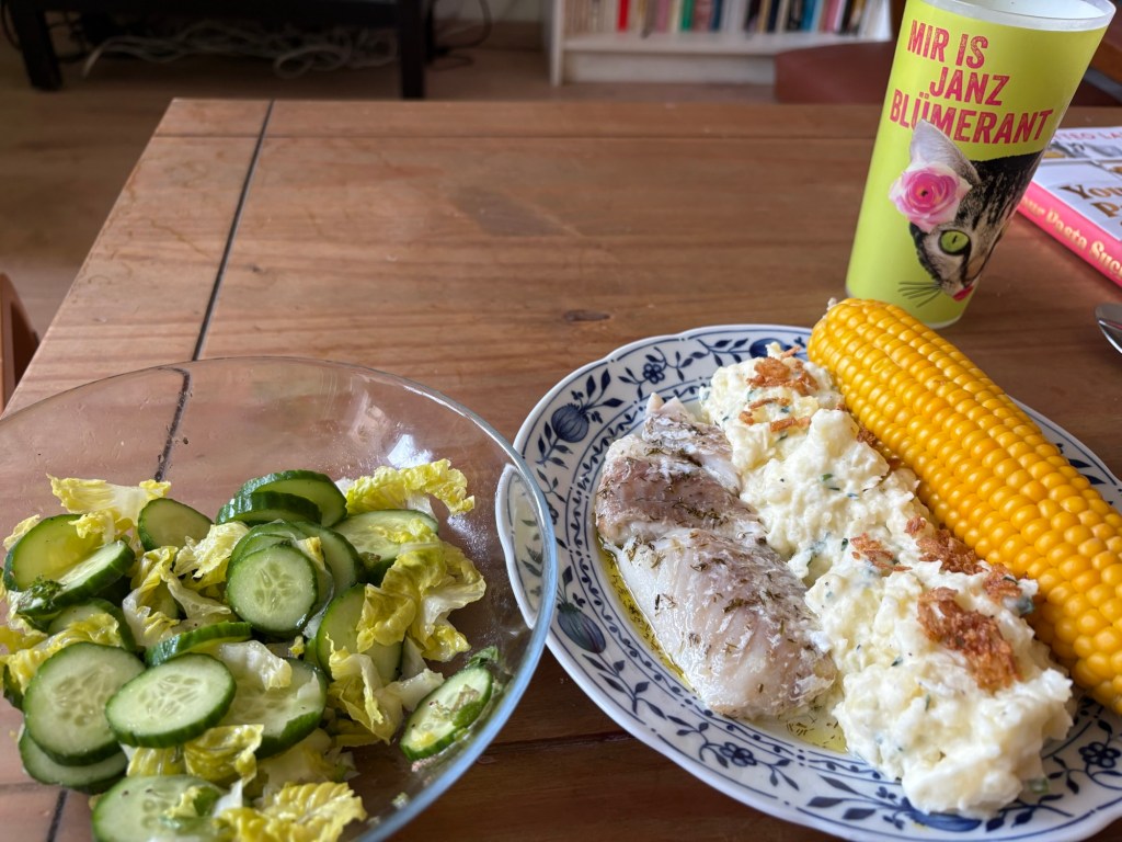 Zuhause dann aber Mascarpone-Sahne auf Erdbeeren und Telefonat mit den Eltern in Nova Scotia. Danach ist mir eigentlich nach einem Nickerchen, aber irgendwie habe ich doch langsam Hunger und es ist dann auch schon ganz schön spät, also besehe ich mir die Vorräte in der Küche und mache mir dann Kabeljau mit Mais, Salat und einem dekadenten Kartoffelbrei mit Sauerrahm, Schnittlauch und Röstzwiebeln – Fertignahrung mit echten Zutaten nachgebaut, sozusagen.