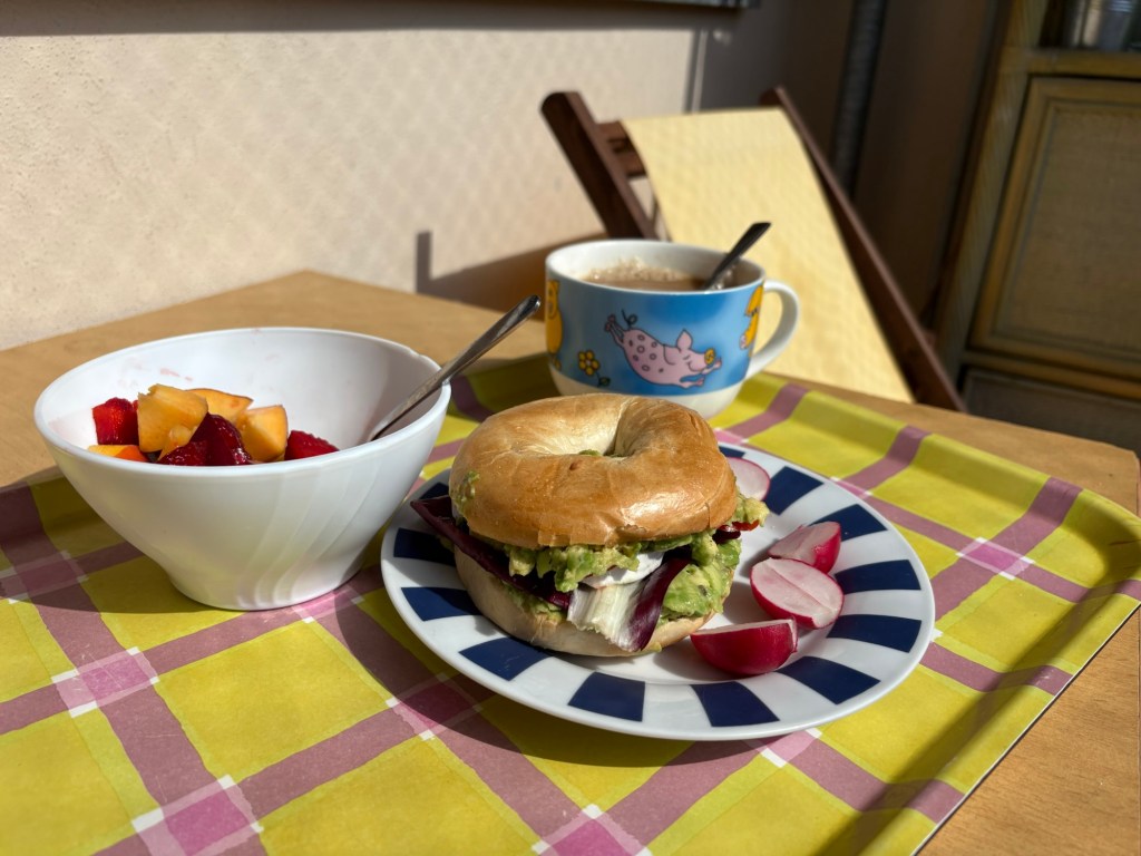 Dann ist es Zeit für Frühstück – ich mache mir einen Avo-Bagel, wie er unten im Café heißt – Bagel mit Avocado, Ziegenkäse, Radicchio und Tomaten, dazu Radieschen, Pfirsich, Erdbeeren und vietnamesischen Kaffee. Mehr Koffein!