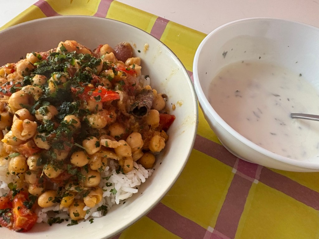 Als der Hunger sich wieder meldet, mache ich mir pakistanisches Chana Masala nach diesem Rezept, von dem der Ex-Mitbewohner mir im Nachgang die Authentizität bescheinigt. Ich muss nur ganz wenig abändern – statt Garam Masala nehme ich Dal Masala, das Lorbeerblatt muss ich weglassen, statt Curcuma habe ich komischerweise so komisches gelbes Currypulver da und statt frischem Koriander nehme ich tiefgefrorenen. Ansonsten passt es, Minze für den Joghurt habe ich auf dem Balkon. Es wird sehr lecker und ich esse eine große Portion und habe dann noch mal mindestens so viel für morgen übrig.