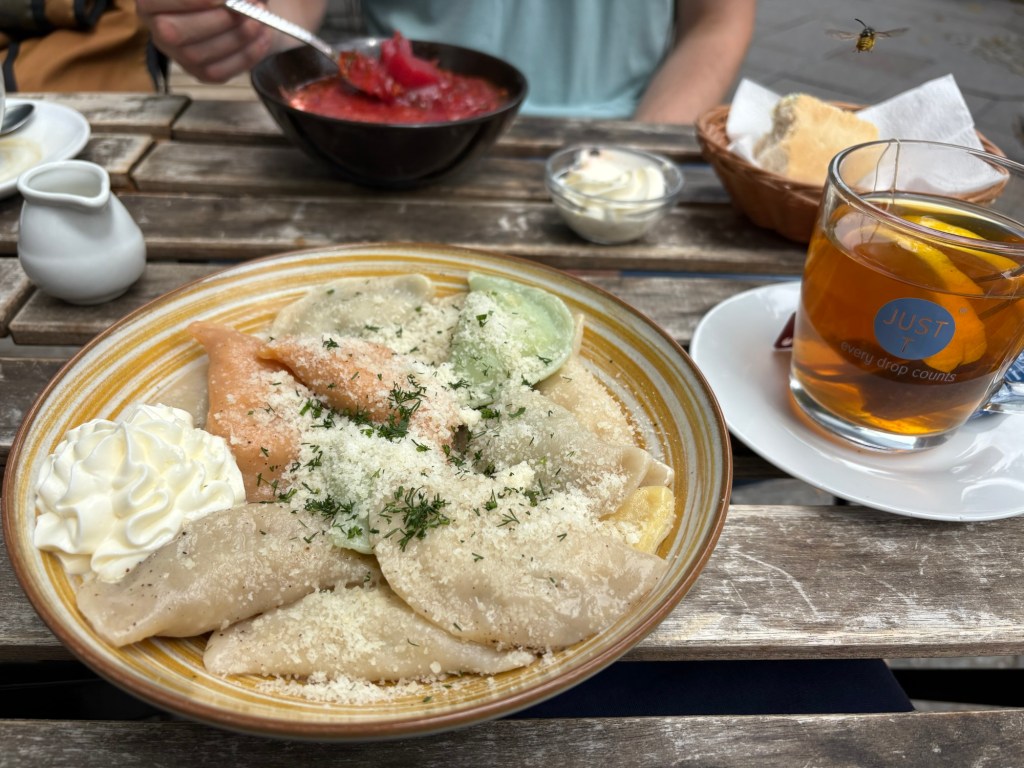 Haare anföhnen und dann noch ein bisschen trocknen lassen, dann geht es los in die Stadt, denn Pläne habe ich ja trotzdem. Mit Tram und U-Bahn fahre ich zur Wohnung der Ellis, gucke nach der Post und den Pflanzen und empfange dann einen Cousin (Wo zaubert sie die nur immer alle her?? Das ist ja ein unerschöpflicher Quell an Cousins und Cousinen! True dat!), der dort mit Freundin und Kind das Wochenende über schläft. Freundin und Kind sind gerade anderweitig beschäftigt und kommen später nach, aber wir beziehen schonmal die Betten und gehen dann die Pelmeni-Bar ausprobieren, die vor einiger Zeit in der Straße aufgemacht hat. Wir essen allerdings (vegetarischen) Borscht und Wareniki und der Cousin berichtet von seinen Aufenthalten in Russland und der Ukraine.
