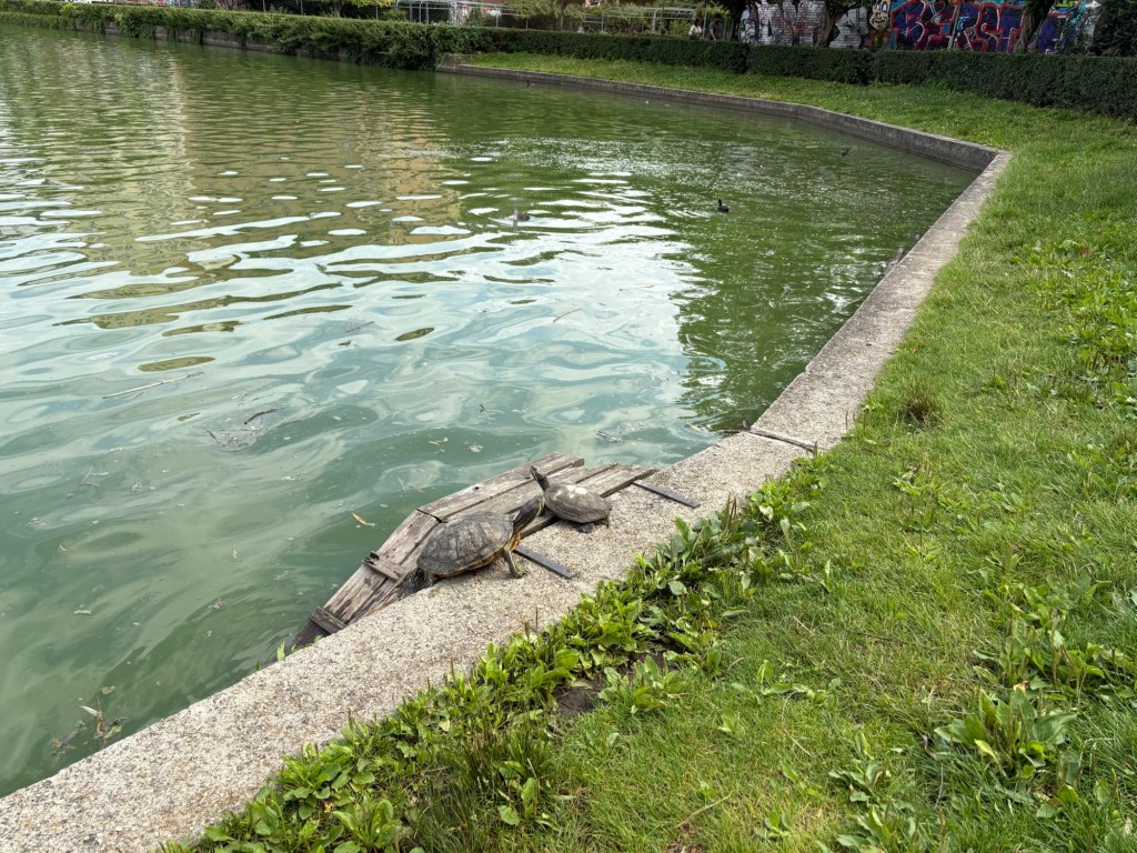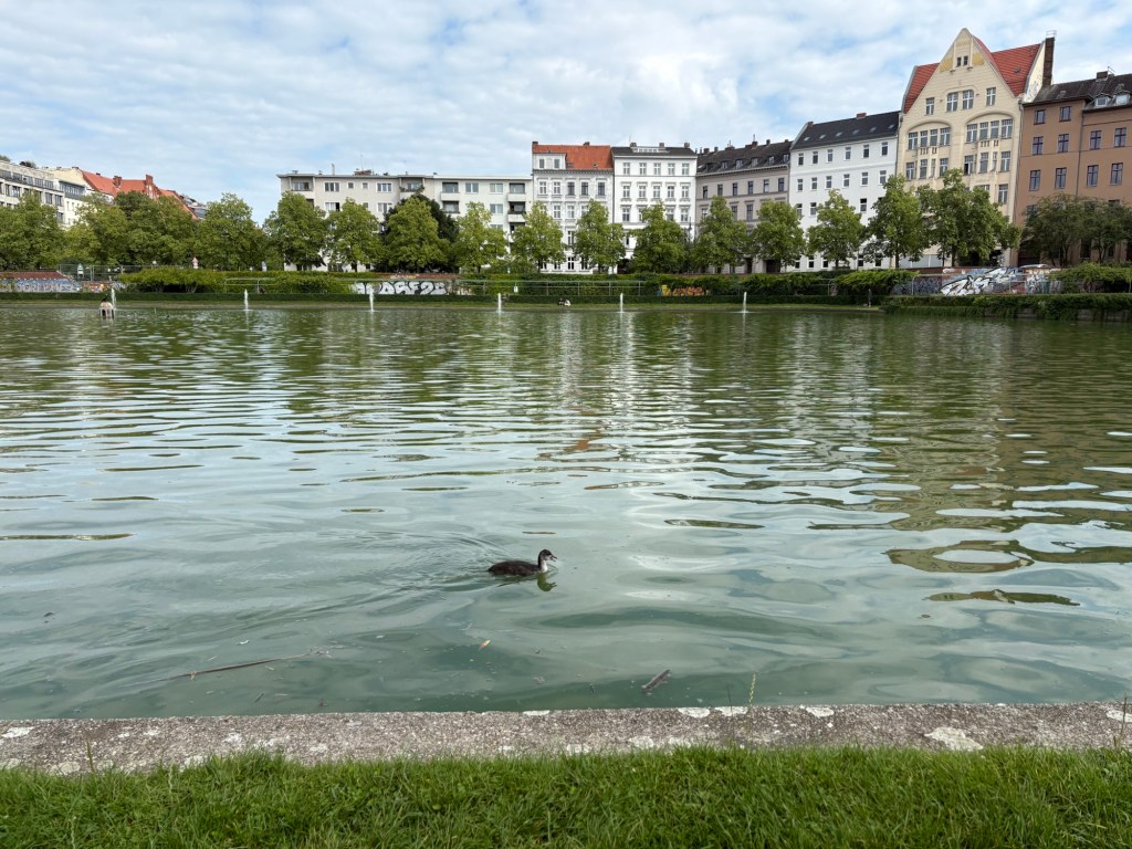 Am Engelbecken kommt die Sonne endlich raus und dann setze ich mich da ins Gras, fange ein neues Buch an und beobachte nebenbei Blässhuhnküken (die erbärmlich rufend ihrer Mama hinterherschwimmen) und Schildkröten.