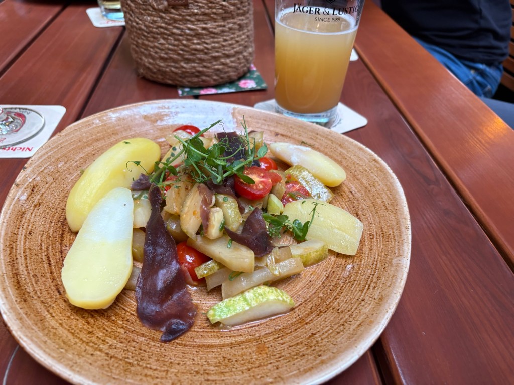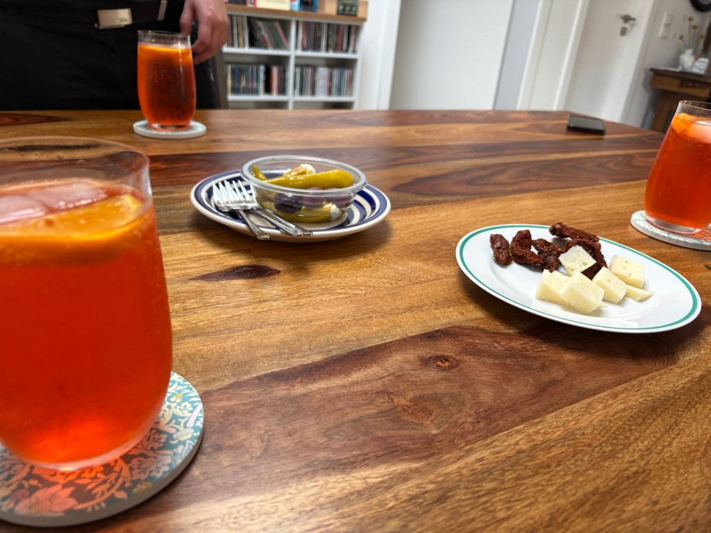 Anderthalb Stunden und ein Liebstentelefonat später laufe ich weiter, über die Spree, am Yaam vorbei, den Streetfoodmarkt am Ostbahnhof entdeckend, und zur Wohnung von Brüderchen und Freundin. Fünf Altbaustockwerke weiter komme ich keuchend oben an und dann weihen wir den neuen Esstisch mit einem ordentlichen Aperitivo ein – der Spritz hat die doppelte Größe wie im Restaurant.