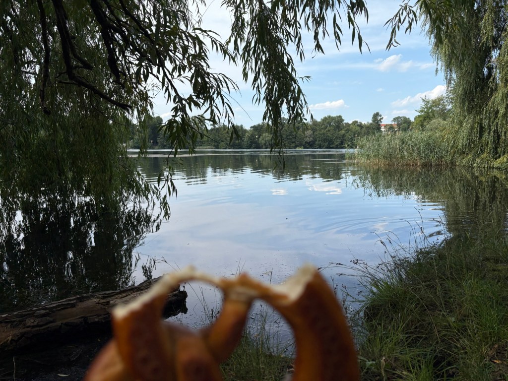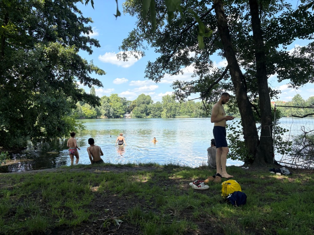 Im Schatten am Wasser ist die Hitze gut auszuhalten und wenn man sitzt, weht sogar ein leichtes Lüftchen. Dafür, dass außerhalb des Strandbads aufgrund von Unglücksfällen ein strenges Badeverbot herrscht, sind an Teilen des Sees extrem viele Menschen im Wasser. Mir reicht das Sitzen und lesen. Irgendwann kriege ich ein Hüngerchen, spaziere einmal um den See, stelle fest, dass das ehemalige Café jetzt ein griechisches Restaurant ist, hole mir am Strandbad eine Butterbrezel und setze mich dann nochmal woanders zum Lesen hin.