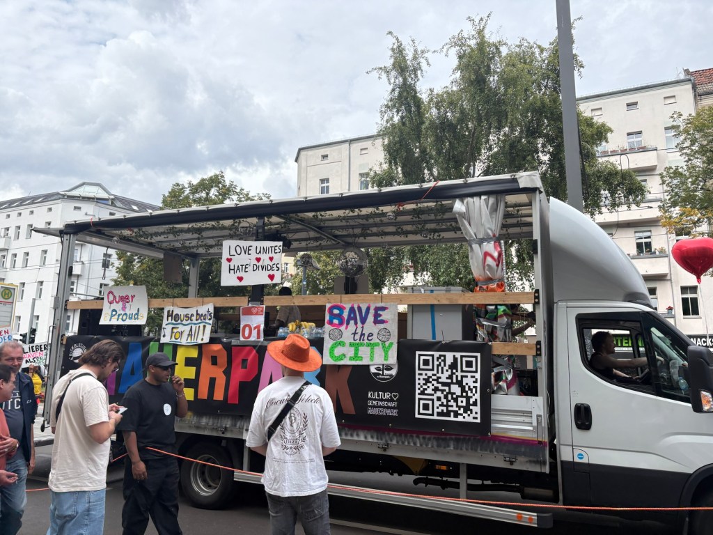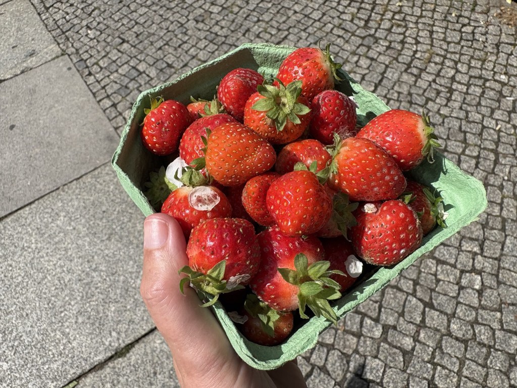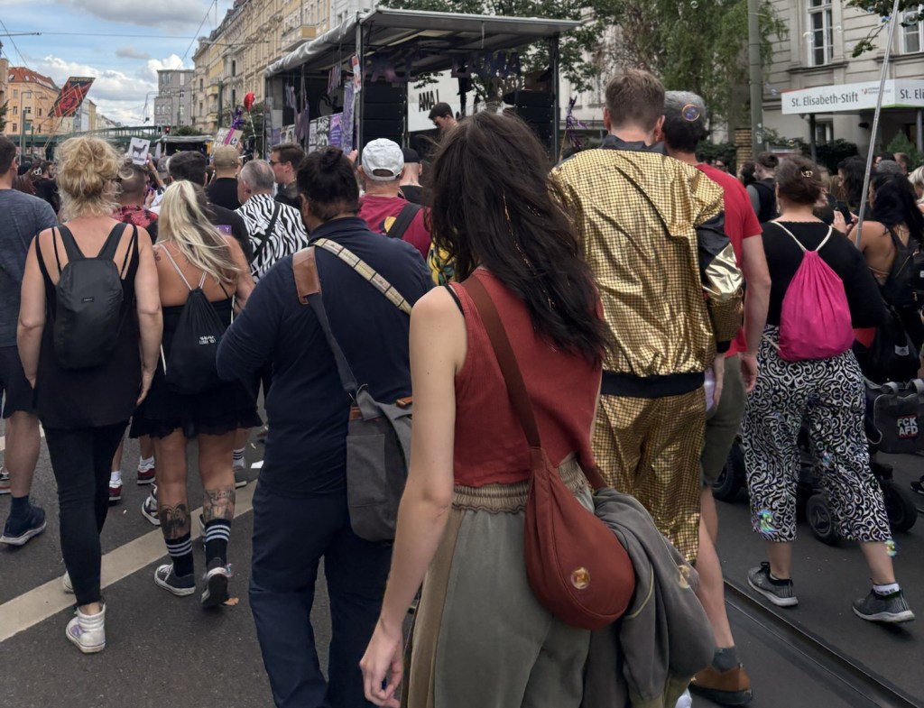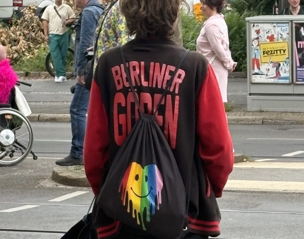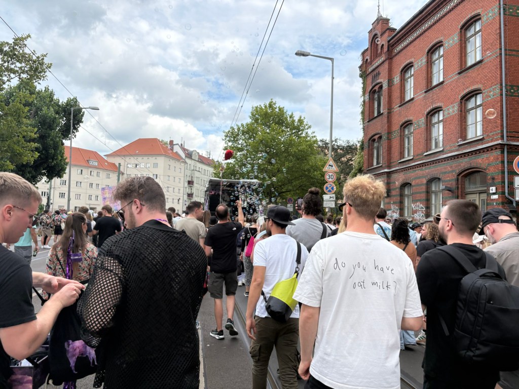Nach dem Essen machen wir uns tagfein – heute ist wieder richtig Sommer – und laufen dann mit einer Wegmate für das richtige Berlin-Feeling los durch den Prenzlauer Berg. In der bayerischen Bäckerei gibt es zwei Brezn für später, dann geht es durch den Mauerpark und mitten ins Gewühl des Zug der Liebe, der heute stattfindet. Wir sind pünktlich zum offiziellen Startpunkt da, aber natürlich dauert es noch anderthalb Stunden, bis sich der Zug in Bewegung setzt. Bis dahin schauen wir uns ein bisschen die verschiedenen Wagen und das Publikum an, kaufen vielleicht letzte Beeren am Erdbeerhäuschen und bekommen Nachricht von indischen Freund*innen des Besuchs aus Dublin, die zufällig auch gerade in Berlin sind. Wir abreden uns für später.
