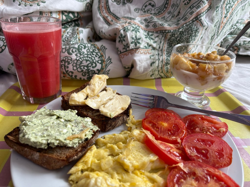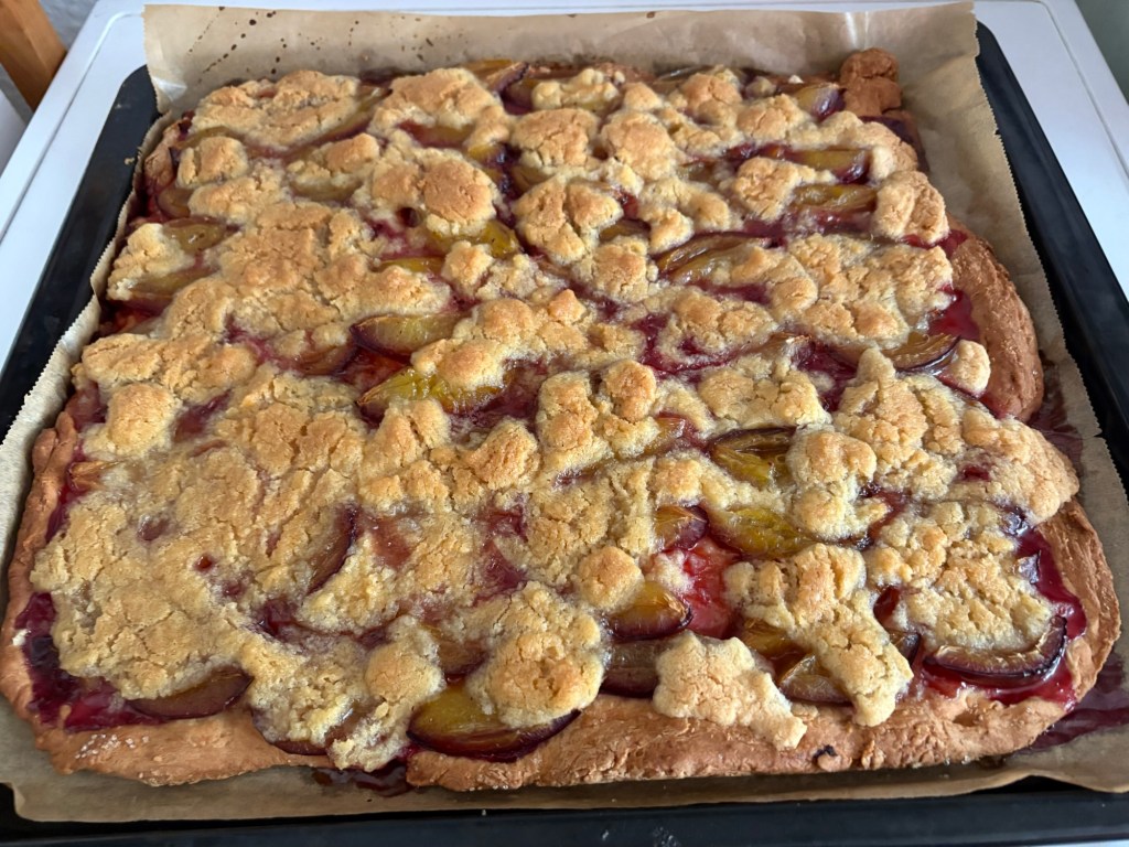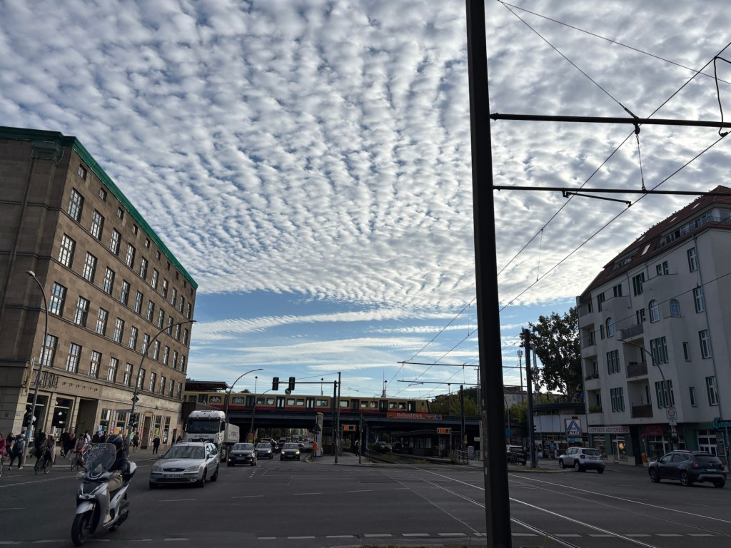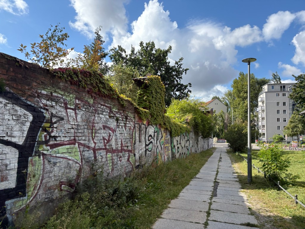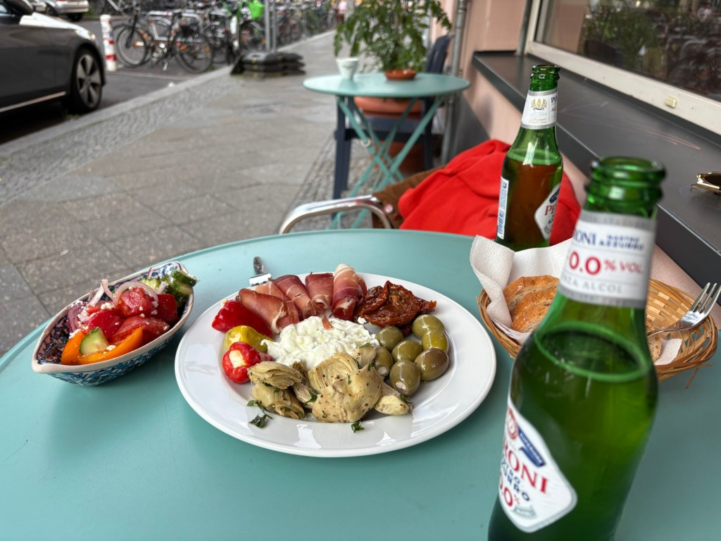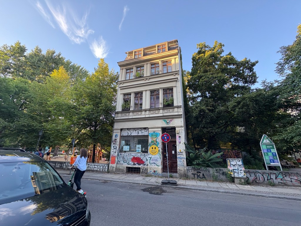 Nach dem Essen machen wir uns tagfein – heute ist wieder richtig Sommer – und laufen dann mit einer Wegmate für das richtige Berlin-Feeling los durch den Prenzlauer Berg. In der bayerischen Bäckerei gibt es zwei Brezn für später, dann geht es durch den Mauerpark und mitten ins Gewühl des Zug der Liebe, der heute stattfindet. Wir sind pünktlich zum offiziellen Startpunkt da, aber natürlich dauert es noch anderthalb Stunden, bis sich der Zug in Bewegung setzt. Bis dahin schauen wir uns ein bisschen die verschiedenen Wagen und das Publikum an, kaufen vielleicht letzte Beeren am Erdbeerhäuschen und bekommen Nachricht von indischen Freund*innen des Besuchs aus Dublin, die zufällig auch gerade in Berlin sind. Wir abreden uns für später.