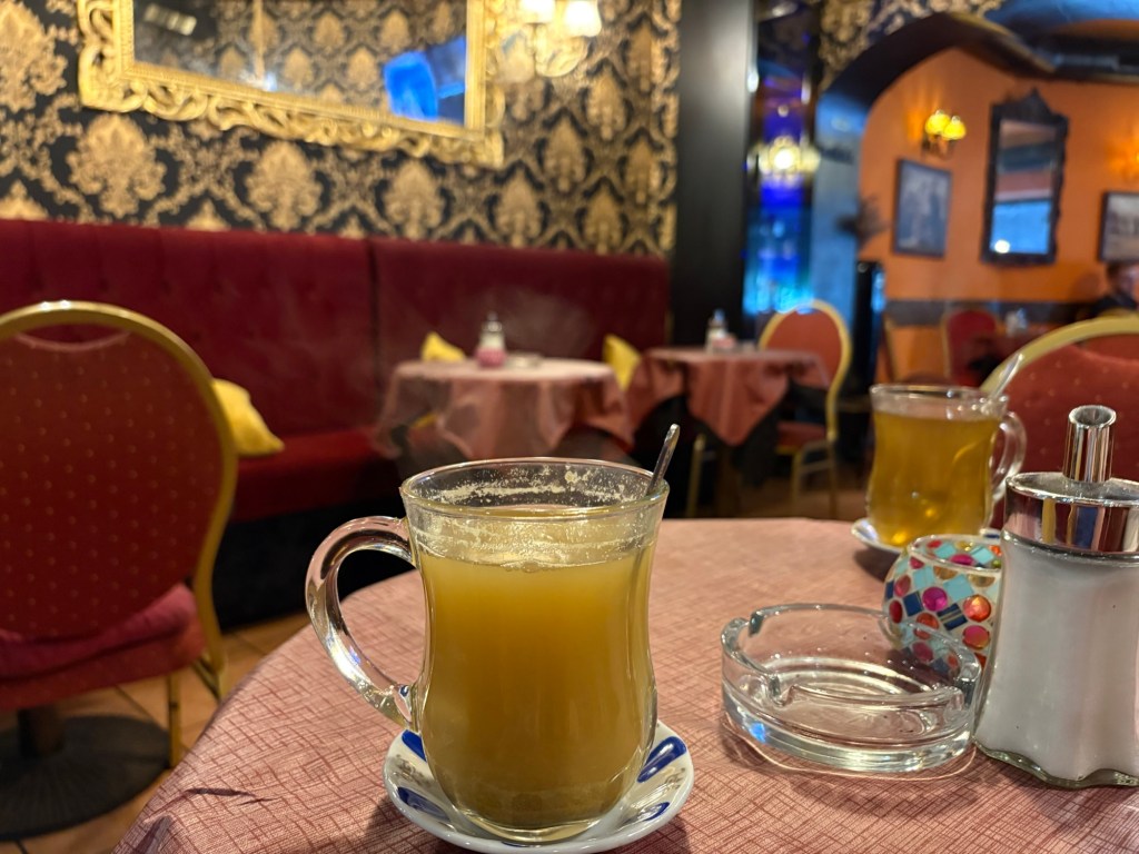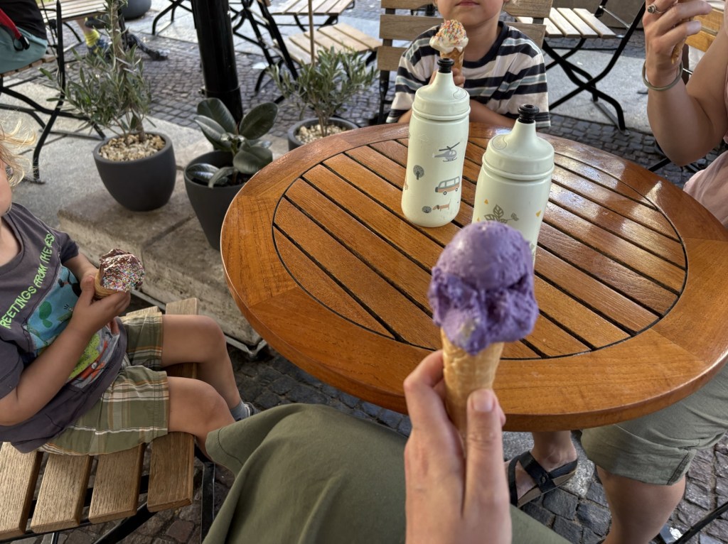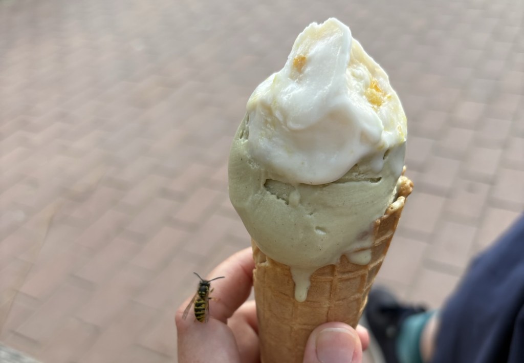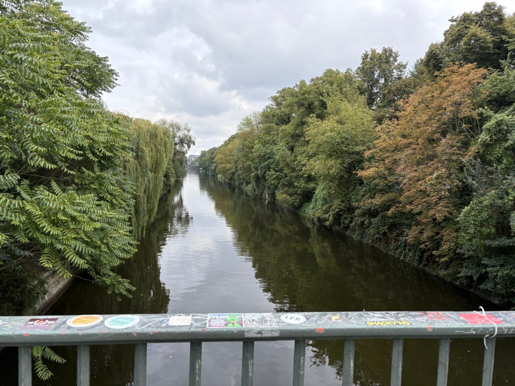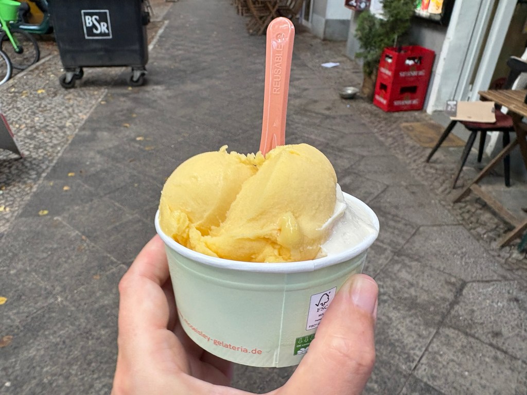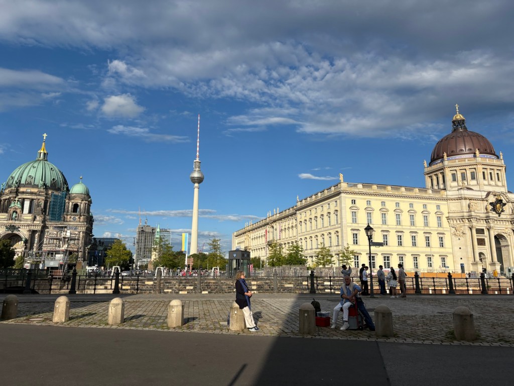Dann melden sich die Freund*innen aus Dublin wieder, ihre Sightseeing-Tour hat am Checkpoint Charlie geendet, und ich lotse sie in ein Eiskaffee am Gendarmenmarkt, wohin wir jetzt mit der U-Bahn aufbrechen. Wir kommen zeitgleich dort an und auch gleichzeitig mit ein paar unangekündigten Regentropfen. Wir essen Eis (Walnuss-Feige/Ananas) und erzählen. Danach geht es zu viert weiter, durch die historische Mitte, über den Schlossplatz, zum Hackeschen Markt und ins Scheunenviertel.