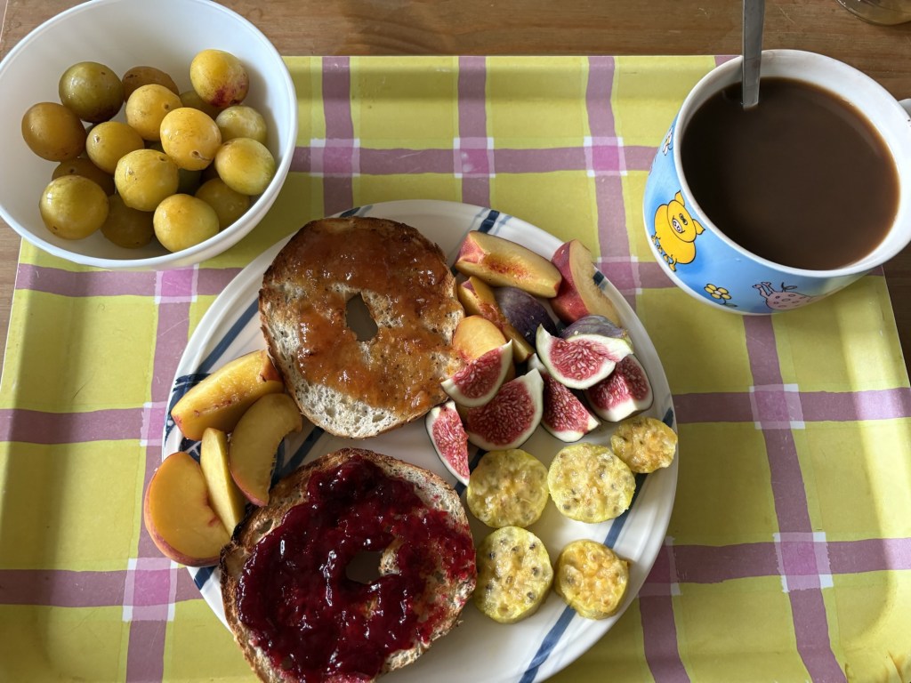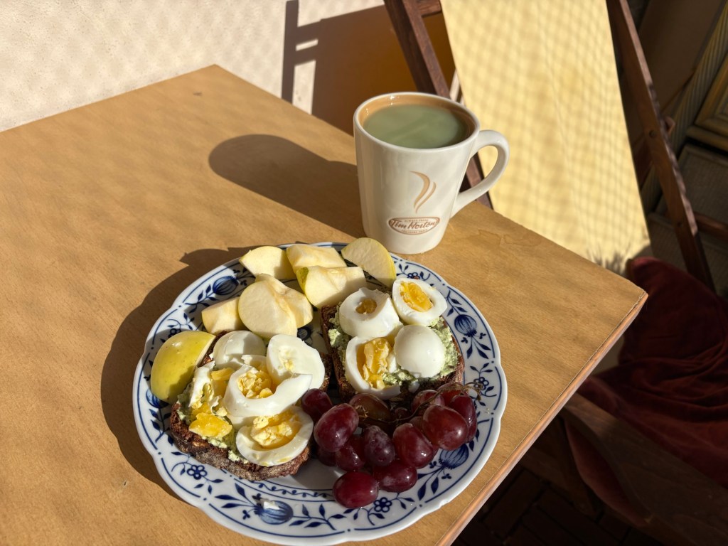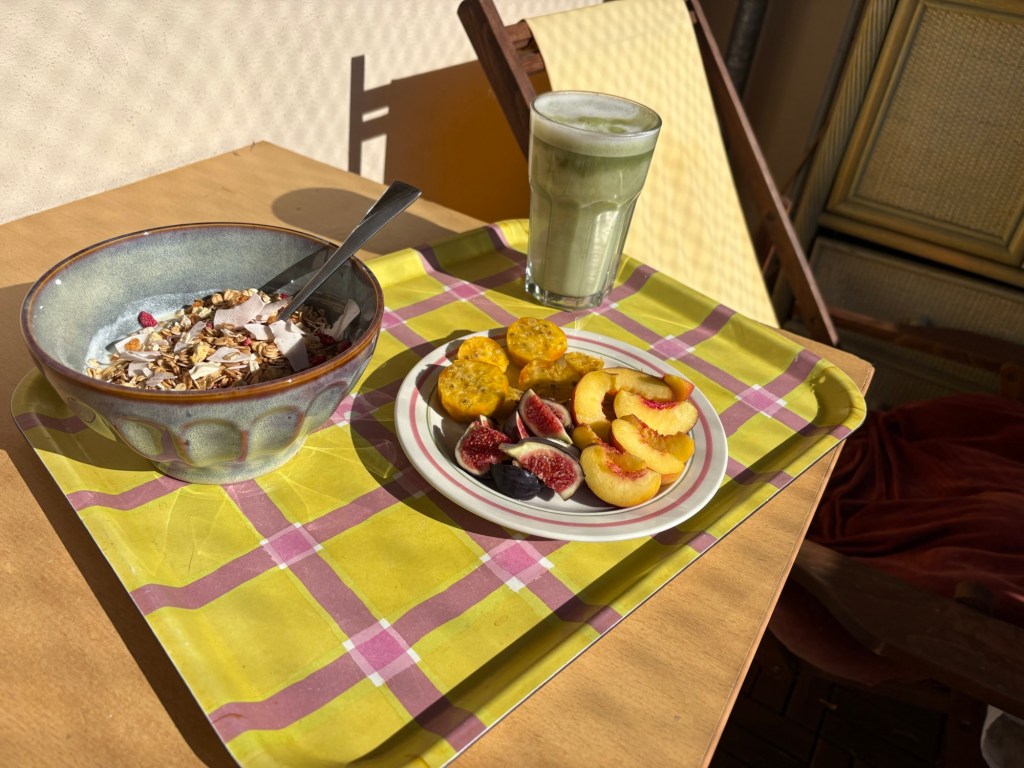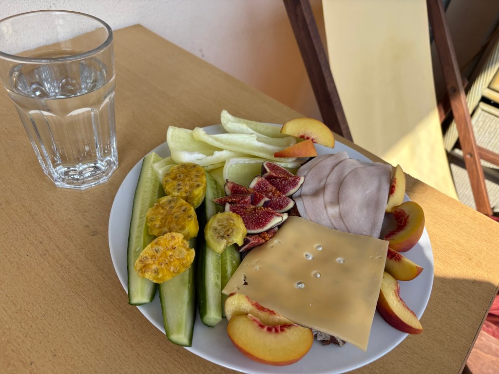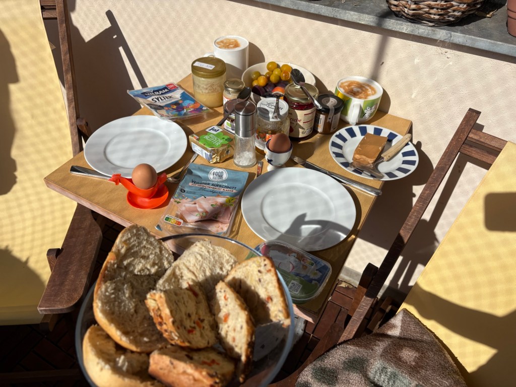 Die Nacht ist länger als die letzte, das ist schonmal sehr super. Leider wache ich mit Schulterschmerzen auf, das ist viel weniger super. Ich knalle mir eine Ibu rein, um Schonhaltungen zu vermeiden und komme so eigentlich ganz gut durch den Tag. Nach dem morgendlichen Reboot steht erstmal ein typisch deutsches Frühstück auf dem Balkon auf dem Plan. Brötchen, Frühstücksei, man kennt das. Für den französischen Besuch hingegen ist das schon das erste touristische Erlebnis heute. Ergänzt wird das typisch Deutsche um südafrikanischen Rooibos-Cappuccino, Brunost und Moltebeerenmarmelade aus Norwegen und Blutorangenmarmelade aus Italien.