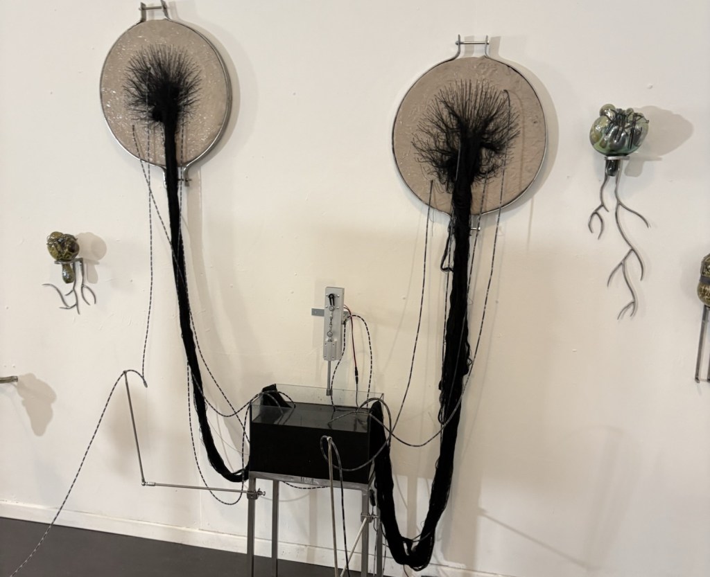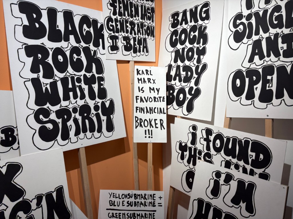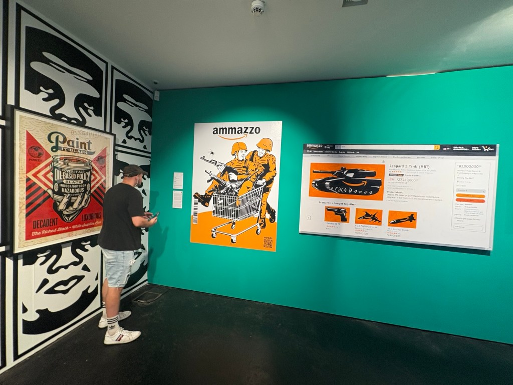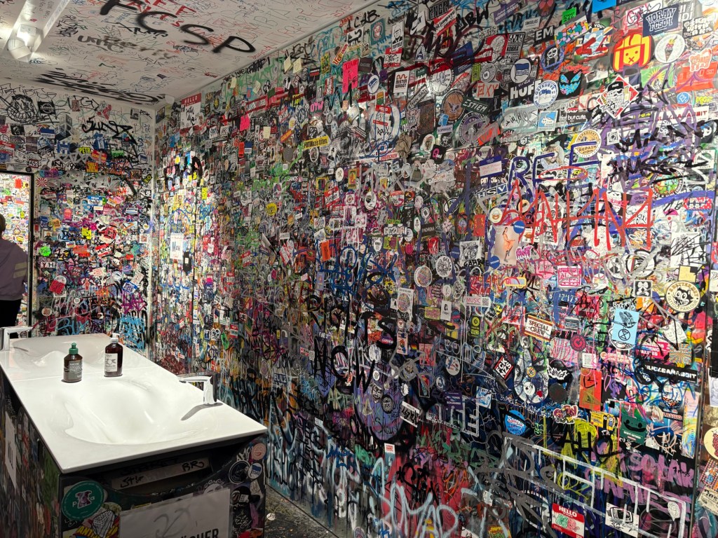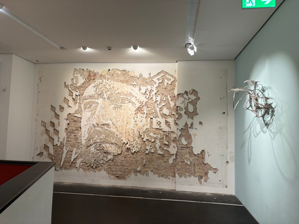 Gegen 11 legt man uns die Rechnung auf den Tisch – der Außenbereich muss jetzt schließen. Wir sind aber eh satt und zufrieden. Der Liebste fährt zurück nach Südberlin (wir sehen uns morgen wieder) und wir laufen weiter zum Nollendorfplatz und dort zum Urban Art Museum. Hier gibt es jede Menge Street und Wall Art, Graffiti, Stencils, Pastings, Sticker etc. und in den oberen Stockwerken kann man heute exklusiv noch einiges an Konzeptkunst sehen und die Künstler*innen kennenlernen.