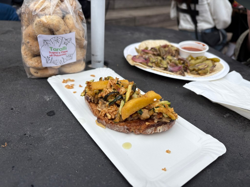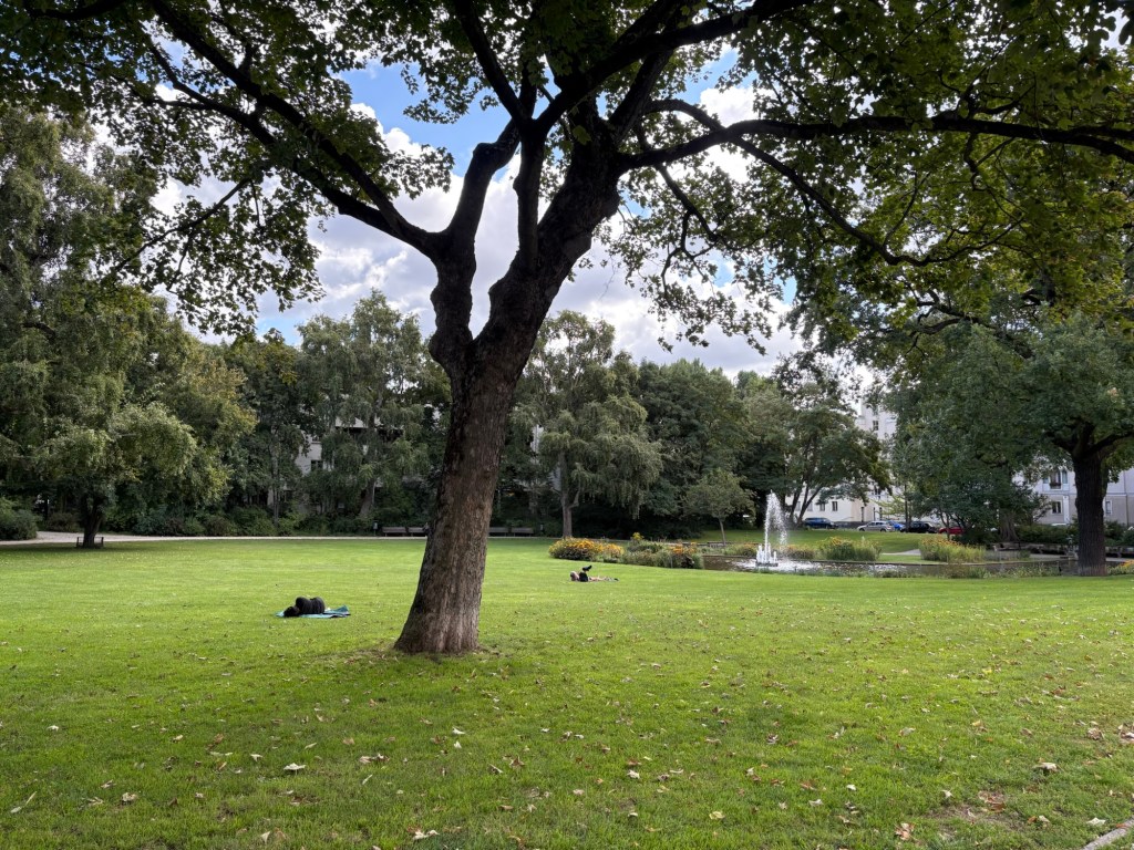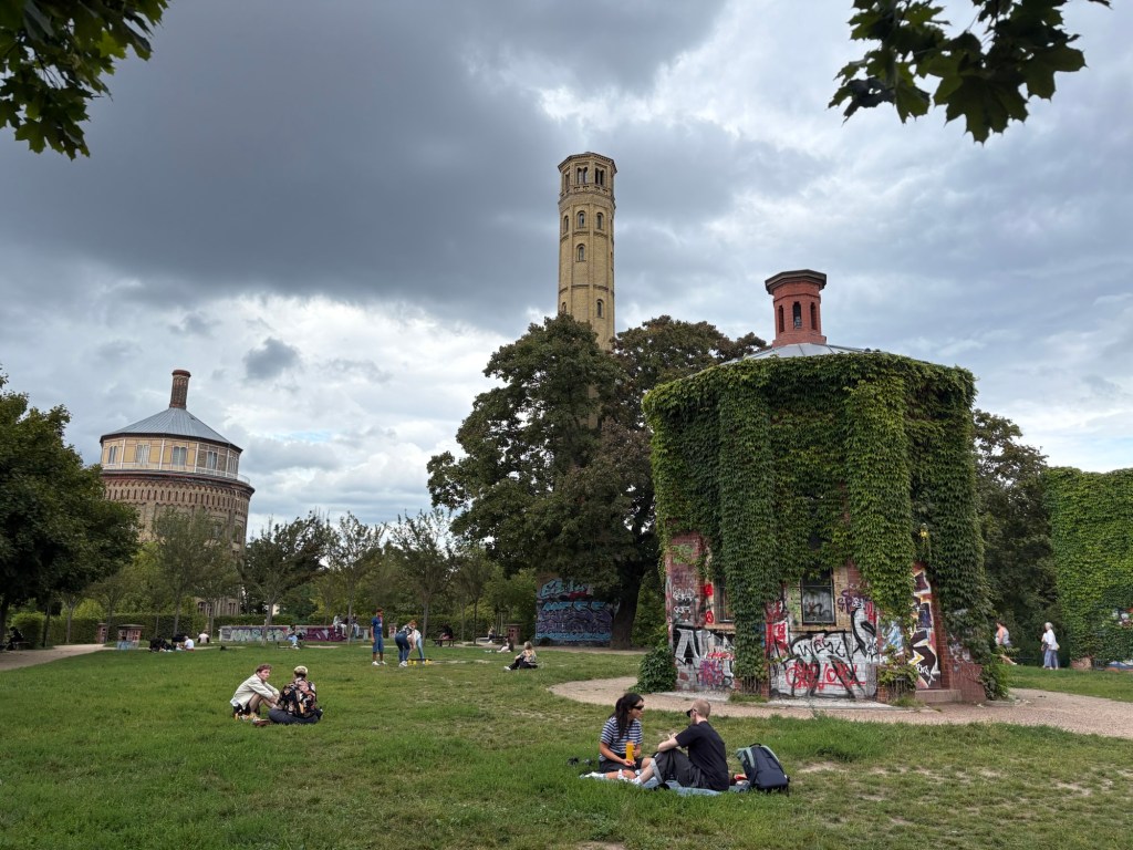 Wir laufen/tanzen hinter drei verschiedenen Wagen die Danziger Straße hinunter, aber dann drängt langsam die Zeit und wir biegen in den vergleichsweise sehr ruhigen Kollwitzkiez ab. Der Markt am Kollwitzkiez ist am Nachmittag viel entspannter als am Vormittag, ich bin ganz überrascht. Wir können ganz gemütlich an den Ständen entlangschlendern und der Besuch kauft sich an einem Stand eine Auswahl veganer Lakritzsorten. Dann geht es weiter zum Wasserturm, wo wir eine kleine Rast im Park einlegen, unsere Füße ins Gras halten und Lakritze (sie) bzw. Brezn naschen.