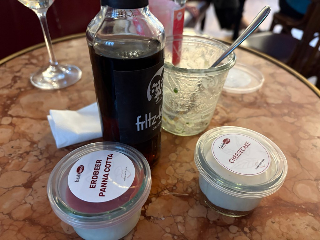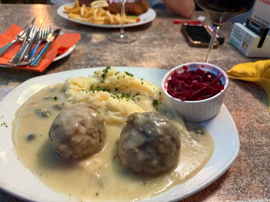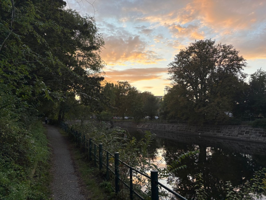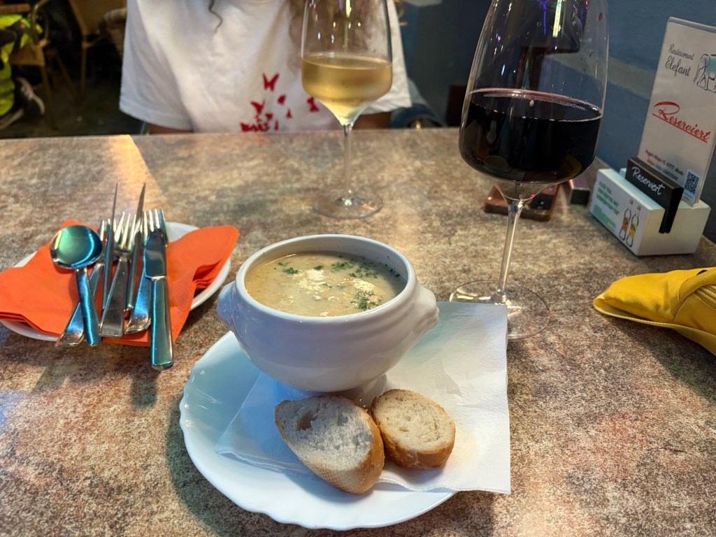 Als Nächstes sind wir mit dem Liebsten zum Abendbrot verabredet – in einem deutschen Restaurant in der Nähe. Was wir vorher nicht wussten: Aktuell findet in Berlin auch die Folsom Europe statt. Die Straßen und auch das Restaurant selbst sind voll von überwiegend Männern in Lack-, Leder-, Bondage- oder Furry-Aufmachung. Das ist noch ein bisschen mehr Schöneberg, als ich dem Besuch vorausgesagt hatte. Für 21 Uhr haben wir erst einen Tisch bekommen, jetzt wissen wir auch, wieso. Es ist immer noch warm genug, um draußen zu sitzen. Der Liebste ist kurz nach uns da, trifft den Besuch zum ersten Mal und dann erzählen wir und genießen Pfifferlingscremesuppe und Wiener Schnitzel bzw. Königsberger Klopse, Wein(-schorle) und Bier während um uns herum die Luzie abgeht. Perfektes Timing.