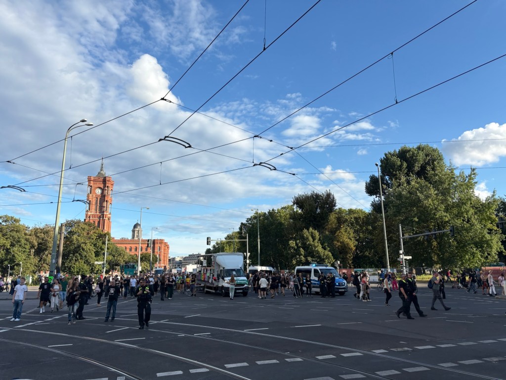 Der Schöpfer und Organisator des Zug der Liebe ist ein ehemaliger Kollege (und Vorgesetzter) von mir. Kurz vor Beginn laufen wir uns über den Weg und quatschen kurz, aber er ist natürlich schwer beschäftigt und koordiniert nebenbei mit Polizei, Sanitätern und den verschiedenen Wagenfahrer*innen. Dann setzt sich der Zug langsam in Bewegung und wir uns mit ihm. Elektronische Musik ist ja nicht so meins, aber es ist ja für diverse gute Zwecke, außerdem unterstütze ich einen Freund und kann dem Besuch ein bisschen von der Berliner Clubkultur zeigen.