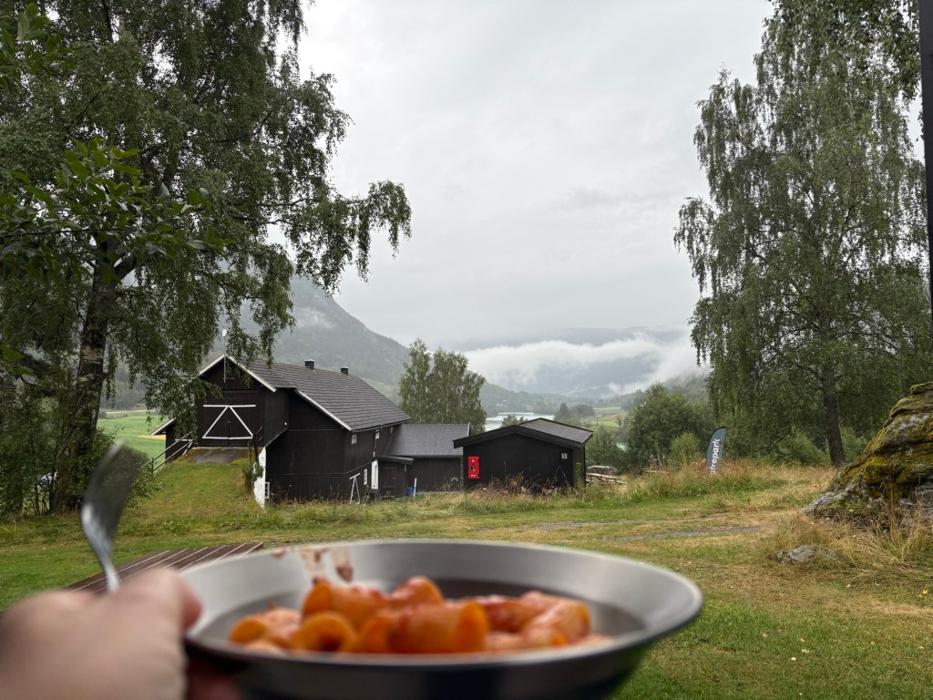 Zum gebuchten Aktivitätenpaket gehört außer den Nudeln gestern auch das Frühstück heute – norwegisches Frühstücksbuffet, einfach aber gut – mit Birnensaft, keiner Kulturmjølk (dafür Joghurt), Brunost, Kaviarcreme, viel Aufschnitt, sauren Gurken und eingelegter roter Bete, Eiern, Knäckebrot und Brötchen, Erdbeer- und Blaubeermarmelade. Außerdem kommt zum Essen die Nachricht, dass das heutige Canyoning wie vermutet ausfallen muss, weil die Schlucht aktuell zu viel Wasser führt und es zu gefährlich ist, als Veranstalter dort mit Kindern durchzugehen/-klettern/-schwimmen. Das Teilzeitkind ist überhaupt nicht amüsiert und braucht erstmal ein bisschen WLAN, um wieder in Balance zu kommen.