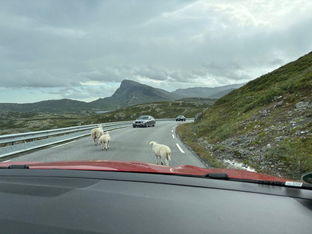 Über die Baumgrenze und an Norwegens höchstem Berg vorbei, dem Galdhøppigen. Der Liebste war schon drauf, ich glaube ich auch – zumindest auf einem der Berge hier, wenn auch nicht ganz oben. Vor lauter Gucken und Staunen und weil wir vor lauter Verkehr kaum mal anhalten können, mache ich gar keine Fotos. Dann aber stockt der Verkehr, es gibt Stau! Der entpuppt sich nach wenigen Metern als Schafherde. Alle Autofahrenden sind geduldig und zücken ihre Handys und keiner regt sich auf. Sehr schön.