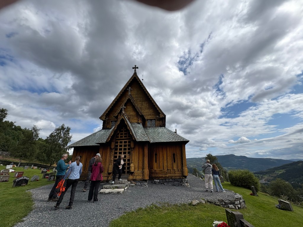 Dann steigen wir ins Auto und rollen los, raus aus dem Tal und über den Bergkamm (so richtig mit Ausblicken und Schotterpiste) ins Nachbartal, wo wir uns eine Stabkirche ansehen wollen.