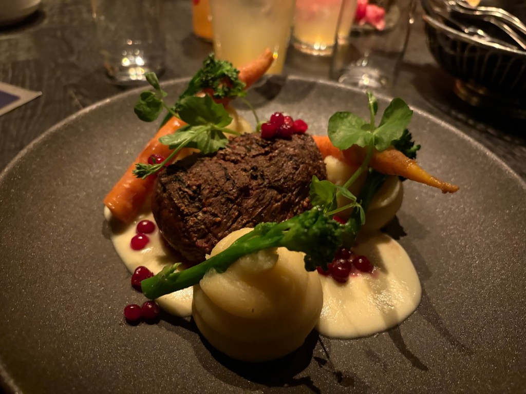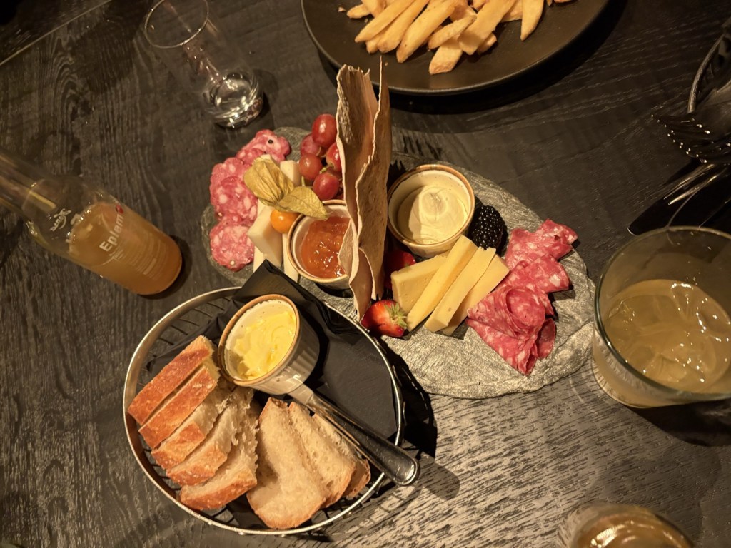 Hinterher für alle ausführliches Duschen auf dem Zimmer, dann gehen wir kurz vor 7 zum Abendessen runter. Es gibt ein Festmahl aus lokalen Wurst- und Käsespezialitäten, Burgern für die anderen beiden und geräucherter Hirschlende für mich, hinterher Patisserie und Sorbets.