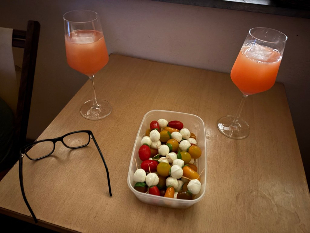 Hier gibt es dann geplant noch die Flasche alkoholischen Bellini auf dem Balkon, ungeplant mit Mozzarella-Spießen. Go with the flow oder so…