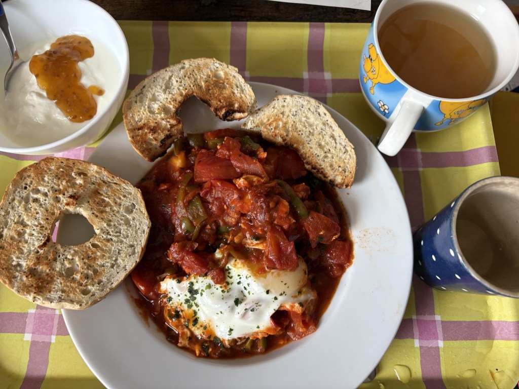 Nach dem ersten Aufwachen kurz nach 6 nochmal ordentlich weggeratzt und dann erst nach 9 wach gewesen. Wie wundervoll das war! Möglicherweise hatte ich etwas Schlaf nachzuholen. Ausführlicher morgendlicher Reboot noch im Bett und aufstehen dementsprechend erst gegen 11. Manchmal ist es auch schön, Klischees zu entsprechen. Dann mache ich mir aber ganz unklischeehaft ein aufwendiges Frühstück und bereite aus Crowdfarming-Tomaten, -Paprika und -Chilis, einer Zwiebel, Knoblauch und einem Rest passata Shakshuka zu – mit zwei Eiern, TK-Koriander und einem Bagel. Dazu der letzte Joghurt, die letzte Moltebeerenmarmelade und ein grüner Tee.