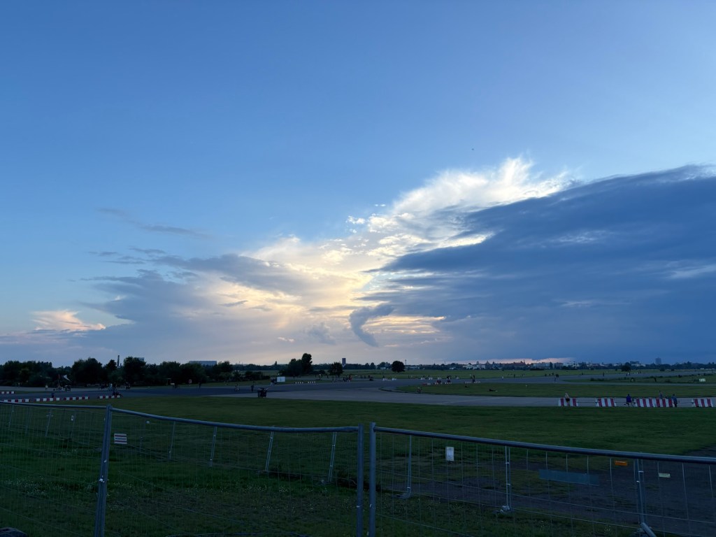 Das Loslesen muss ich aber verschieben, denn ich habe heute tatsächlich noch einen Termin im Draußen und muss mich also stadtfein machen und rechtzeitig das Haus verlassen. Sonst bin ich quasi nie in Neukölln und noch viel nier am Tempelhofer Feld, jetzt häufen sich die Male plötzlich. Ich bin ein bisschen zu früh am Treffpunkt und schaue also nochmal kurz auf dem Feld nach dem Rechten. Es ist gerade Regenpause und sofort wieder voll. Verstehe jetzt inzwischen die Leute, die jegliche Randbebauung ablehnen.