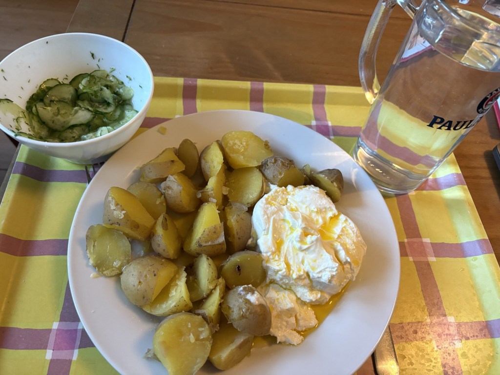Zum Abendbrot dann Pellkartoffeln, Quark, Leinöl und Gurkensalat. Dazu schaue ich – gestern war mir das nach dem See zu düster, heute nach dem Buch passt es – die ersten vier Folgen der aktuellen Staffel Wednesday. Wieder sehr viele schöne Details und witzige Oneliner, auch wenn mich die Handlung selbst nicht so fesselt. Ich finde es faszinierend, wie viele Kinder in meinem Umfeld die Serie (zumindest Staffel 1) gesehen haben und wie präsent die Figur in Kinderköpfen ist. Die Serie ist vermutlich zu Recht ab 16 und ich bin nicht sicher, ob das zwölfjährige Teilzeitkind für alle gruseligen Aspekte schon bereit wäre.