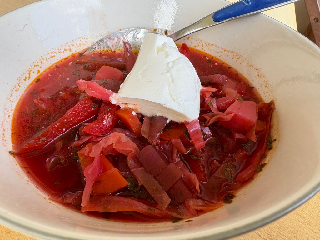 Als die wichtigen und dringenden Dinge geschafft sind, mache ich Pause und esse von dem leckeren Borschtsch, den die Mitbewohnerin gekocht hat – mit Paprika, nach dem Rezept ihrer Oma, sehr gut und außerdem besonders, weil die Mitbewohnerin sich normalerweise maximal Pasta mit Pesto macht. „Einmal im Jahr kann man ja“, sagt sie. Unbedingt!