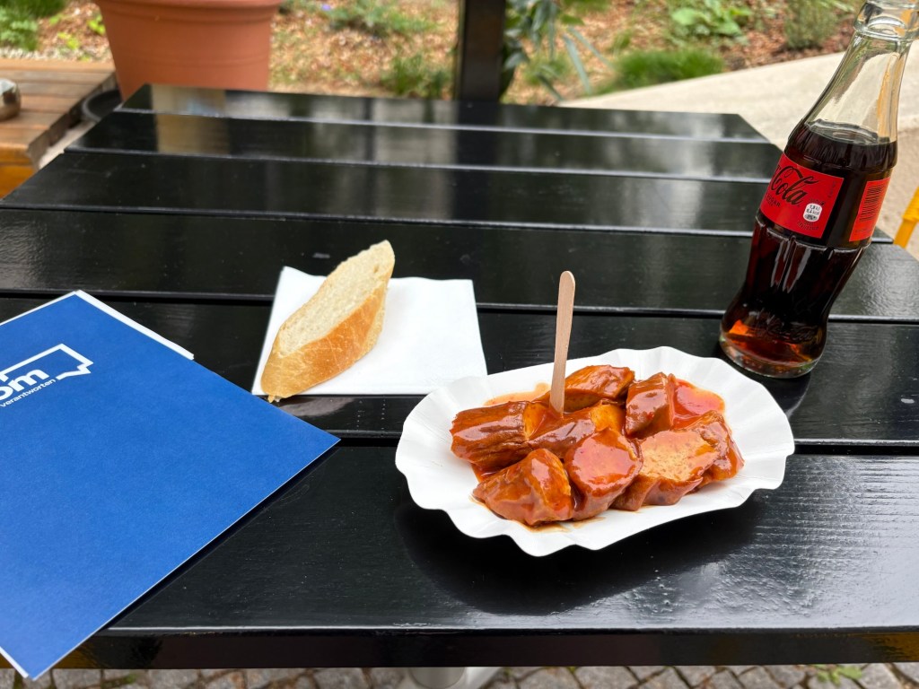 Ich verspüre ein leichtes Hüngerchen, freue mich auf das Catering später und hoffe auf ein bisschen Knabberkram zwischendurch. Den gibt es, und zusätzlich auch noch Currywurst mit Baguette, vegan oder mit Fleisch.