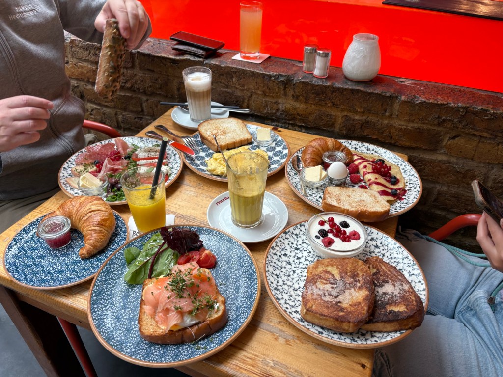 Früh, aber nicht zu früh erwacht, damit kann ich durchaus arbeiten, wenn vorher durchgeschlafen wurde. Nach gemütlicher Morgenroutine im Bett folgt leicht hektisches Aufstehen, Katzen füttern und Packen, denn das Frühstück wird heute erst in Südberlin eingenommen. Die Ringbahn fährt wieder, die U-Bahn mir hingegen vor der Nase weg. Zehn Minuten hungrig herumsitzen am Westhafen, aber das ist Jammern auf hohem Niveau. Nur drei Minuten nach der Zeit komme ich im Stamm-Frühstückslokal an, etwa drei Minuten vor dem Liebsten und dem Teilzeitkind, dem auch ein Bus vor der Nase weggefahren ist, als es aus Brandenburg anreiste. Jetzt aber wieder: alle drei zusammen. Sofort eskalieren wir bei der Frühstücksbestellung.