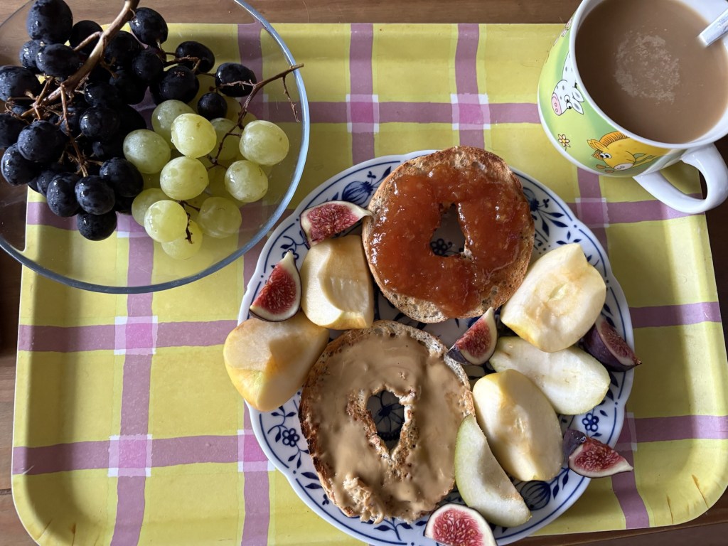 Dann Frühstück (drinnen, heute ist draußen so richtig Herbst, bevor am Wochenende ein letztes Sommeraufbäumen auf dem Plan steht) mit Bagel, Ahornsirupcreme, Blutorangenmarmelade, Chai und Obst.