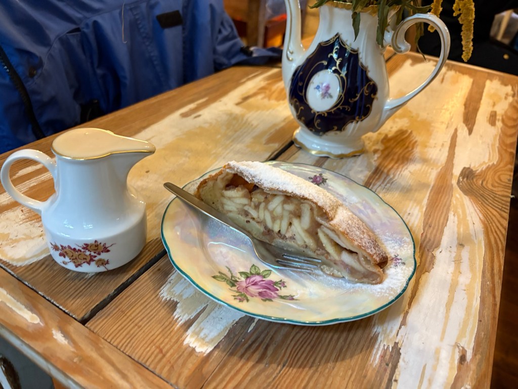Runde 3 ist ein großes Randstück Apfelstrudel mit warmer Vanillesauce. Danach hole ich den Laptop raus und arbeite ein bisschen.