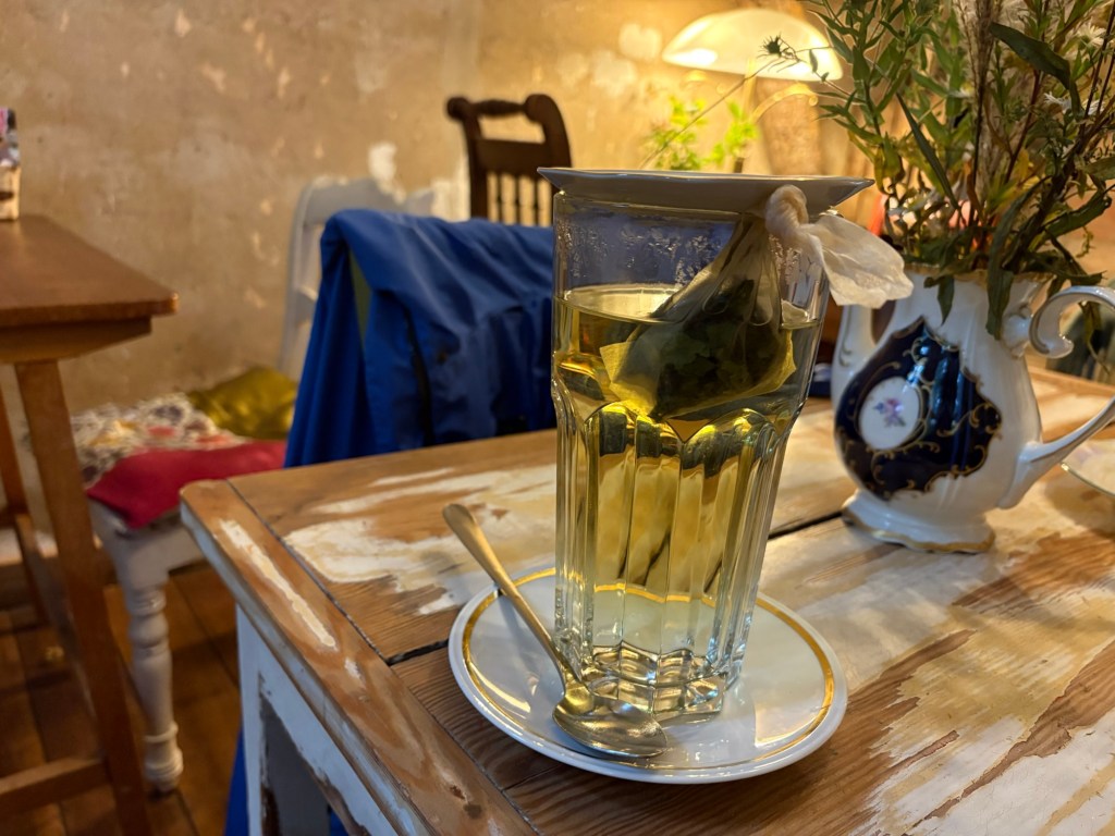Heute ist den ganzen Tag Regen angesagt, mal mehr, mal weniger stark, mal mit Böen, mal ohne. Ich laufe direkt von der Straßenbahn ins Stammcafé, sichere mir meinen Lieblingsplatz auf dem Bett und einen Matcha Latte. Runde eins.