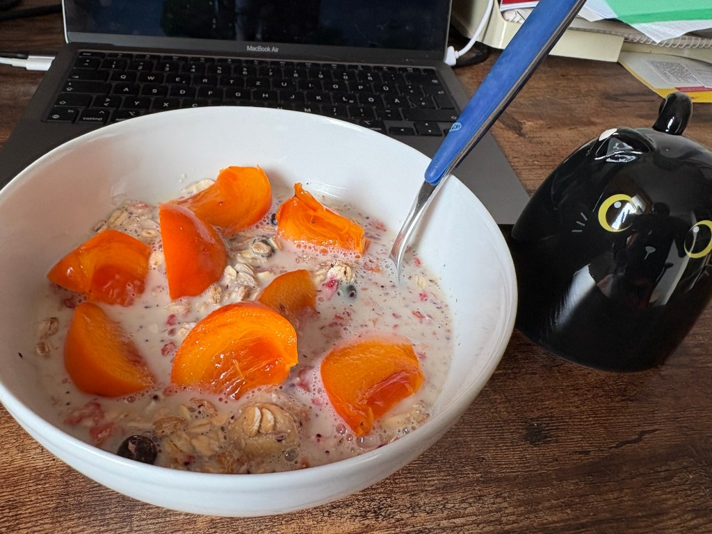 Der Montagmorgen serviert wegen eines Unfalls Bahnchaos, so dass ich ganz anders fahren muss als geplant, eine Bahn mehr brauche und am Ende pünktlich zum Termin bin statt wie geplant eine Viertelstunde früher. Auch OK. Ich bekomme von einer fröhlich plaudernden Dame Blut abgenommen, diesmal ärgert sie sich nicht über die Gen Z, sondern einfach über die eingetroffene Herbstigkeit des Wetters und des Lichts, damit kann ich mehr anfangen. Dann geht es auf noch anderem Weg wieder zurück nach Hause, so dass ich pünktlich um 9 mit Müsli, Obst und Tee am Schreibtisch sitze.