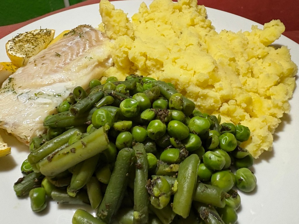 Danach nochmal ausführlicheres Liebstentelefonat und ausgiebiges Elterntelefonat. Hinterher stelle ich mich an den Herd und mache mir zum Abendbrot Kabeljau mit Kartoffelbrei, Erbsen und Bohnen.