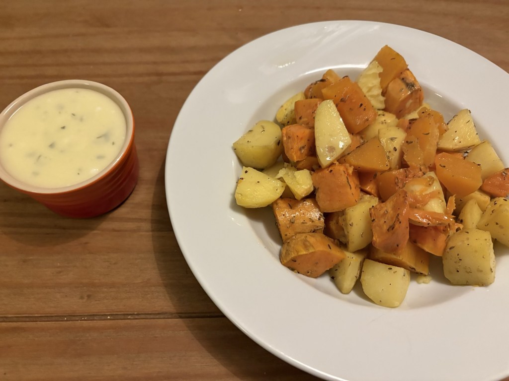 Wieder zuhause direkt in die Abendessenvorbereitung. Es gibt Ofengemüse aus Butternut-Kürbis, Süßkartoffeln und Kartoffeln mit ordentlich Thymian und eine Art veganes Aioli. Weil ich das Rezept nicht richtig lese und die Reihenfolge nicht beachte wird die Emulsion aus Olivenöl und Hafermilch allerdings nicht richtig cremig. Ich helfe mit Kokosjoghurt nach, dann passts. Für den Geschmack kommt außer Knoblauch, Salz und Zitrone noch ein bisschen Estragon dazu.