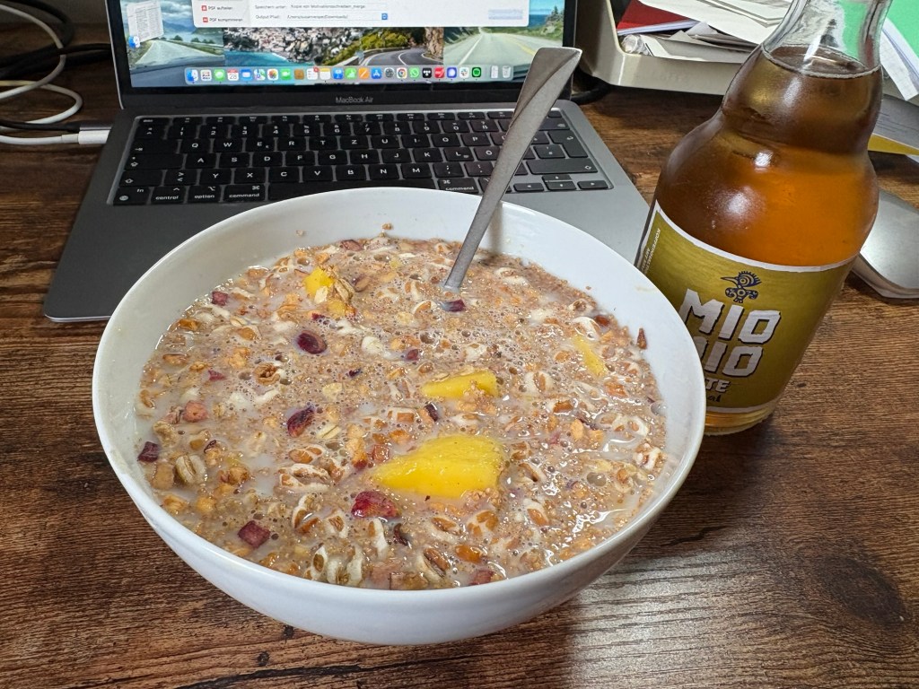 Ganze Crowdfarming-Mango, Cranberry-Pistazien-Müsli, Mate, später Kräutertee
