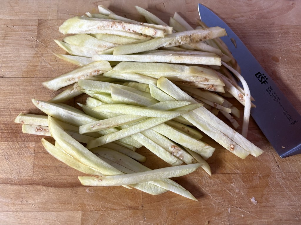 Ich schäle die zwei letzten Crowdfarming-Auberginen und schneide sie in feine Streifen. Dann werden sie mit ordentlich Salz und Essig vermengt, in ein Sieb gegeben und beschwert, um die Flüssigkeit rauszubekommen. Etwa drei Stunden soll das dauern, sagt das Rezept von TikTok.
