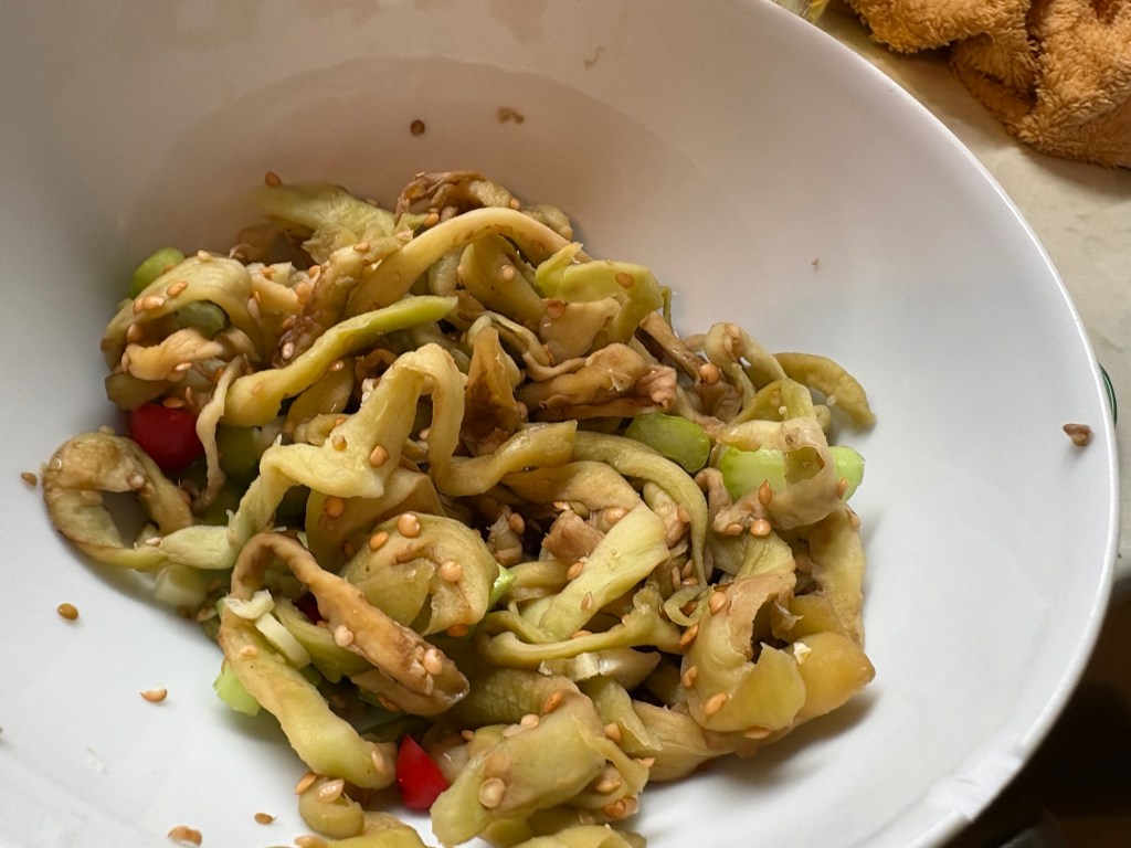 Drei Stunden später also stopfe ich die inzwischen weichen Auberginen in einen Waschlappen und presse jede Menge Flüssigkeit heraus. Dann koche ich ein Einweckglas aus, gebe etwas Sonnenblumenöl hinein, vermische die Auberginenstreifen mit Knoblauch, Peperoni und Sellerie, fülle sie in das Glas, gieße mit viel Öl auf, so dass sie bedeckt sind, und verschließe das Glas.
