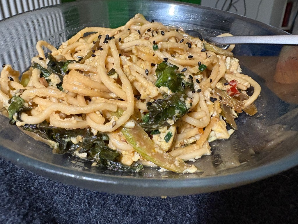 Das dritte ist das Abendessen. Es gibt Crowdfarming-Pak Choi mit Crowdfarming-Chili, Sellerie, Ei und chinesischen Nudeln, dazu Sojasauce, Sesamöl, Schnittlauch und schwarzen Sesam. Sehr lecker.