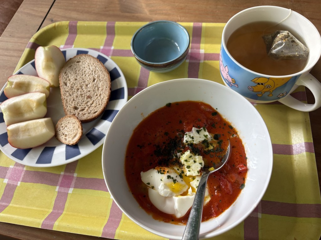 Dann aufstehen, Katzen versorgen, frühstücken. Es gibt den Rest Tomatensauce von gestern, aber das ist nicht so viel, dass es sich für Shakshuka-Zubereitung eignet, also koche ich die Eier separat und pelle sie dann in noch weichem Zustand, was eine ziemliche Sauerei ist. Schmeckt aber trotzdem.