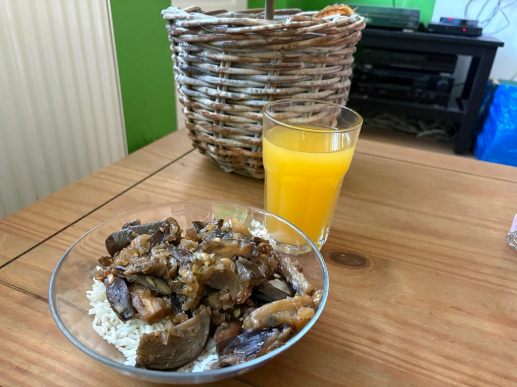 Wieder oben wird alles verräumt, dann gibt es eine Portion Szechuan-Auberginen mit Reis und weitere Haushaltswerkeleien.