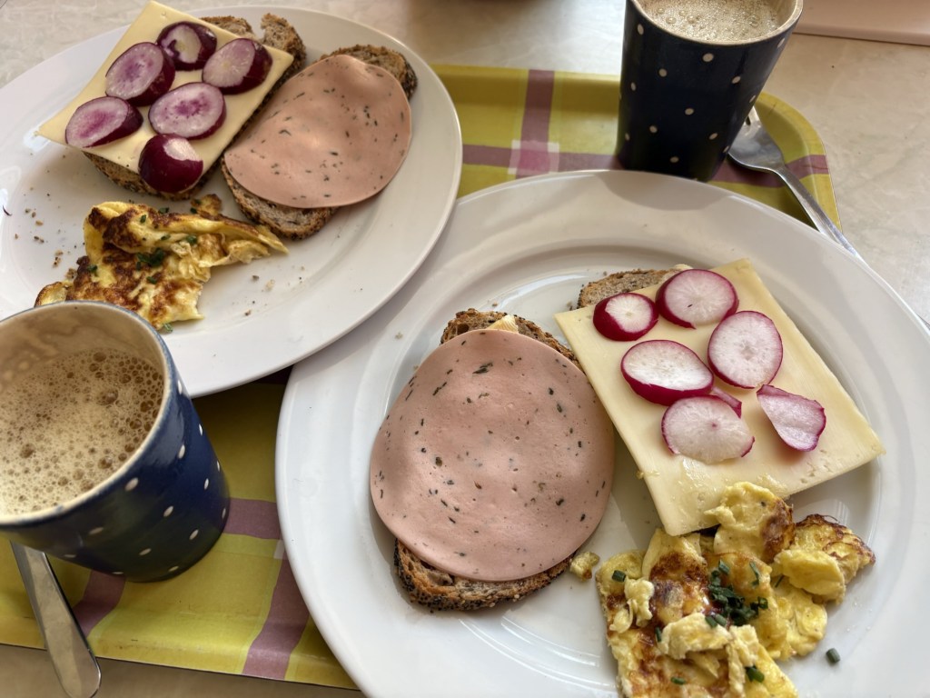 Aufwachen mit dem Liebsten und den Katzen im Bett, das gab’s in dieser Konstellation schon eine geraume Zeit nicht mehr, ist aber sehr schön. Es gibt Kaffee im Bett und dann sehr langes Herumlungern in selbigem während des morgendlichen Reboots. Dann findet der Liebste, wir könnten schon auch noch im Bett frühstücken, ausnahmsweise. Na klar!