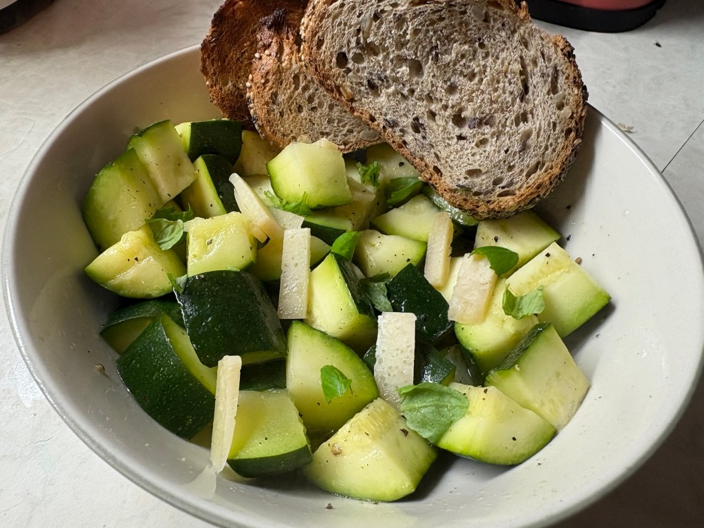 Dann ist schon langsam wieder Abendbrotzeit. Ich habe ja immer noch saisonal untypische Crowdfarming-Zucchini und koche mir eine davon auf ungefähr griechische Art, nämlich in Wasser. Dazu gibt es auf ebenso griechische Art Olivenöl, Salz und Zitrone, meine innere Italienerin ergänzt dann aber noch Basilikum und Grana Padano. Schmeckt auch im Winter!