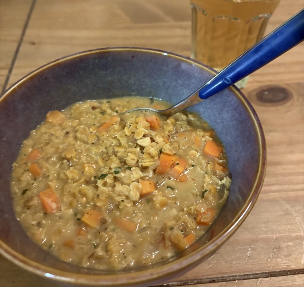 Dann auf dem gleichen Weg zurück, mit kurzem Stop am Supermarkt. Wieder zuhause bin ich dann erstmal ziemlich platt und bekämpfe das mit erstens Sofa und zweitens vietnamesischem Kaffee. Als ich wieder einigermaßen Energie habe, telefoniere mich erst mit dem Liebsten, dann mit den Eltern, dann mit dem Bruder und dann ist es auch schon 18 Uhr. Mir fällt auf, dass ich seit dem Müsli nichts gegessen habe, also schmeiße ich mir einen Koch-Podcast an und stapfe in die Küche. Heute gibt es ein Dal aus roten Linsen, Zwiebeln, Knoblauch, Ingwer, Kurkuma, Gemüsebrühe, Kokosmilch, Koriander, Cumin, Kardamom, Zimt, Zitrone, grünem Chili, Koriandergrün und Salz.