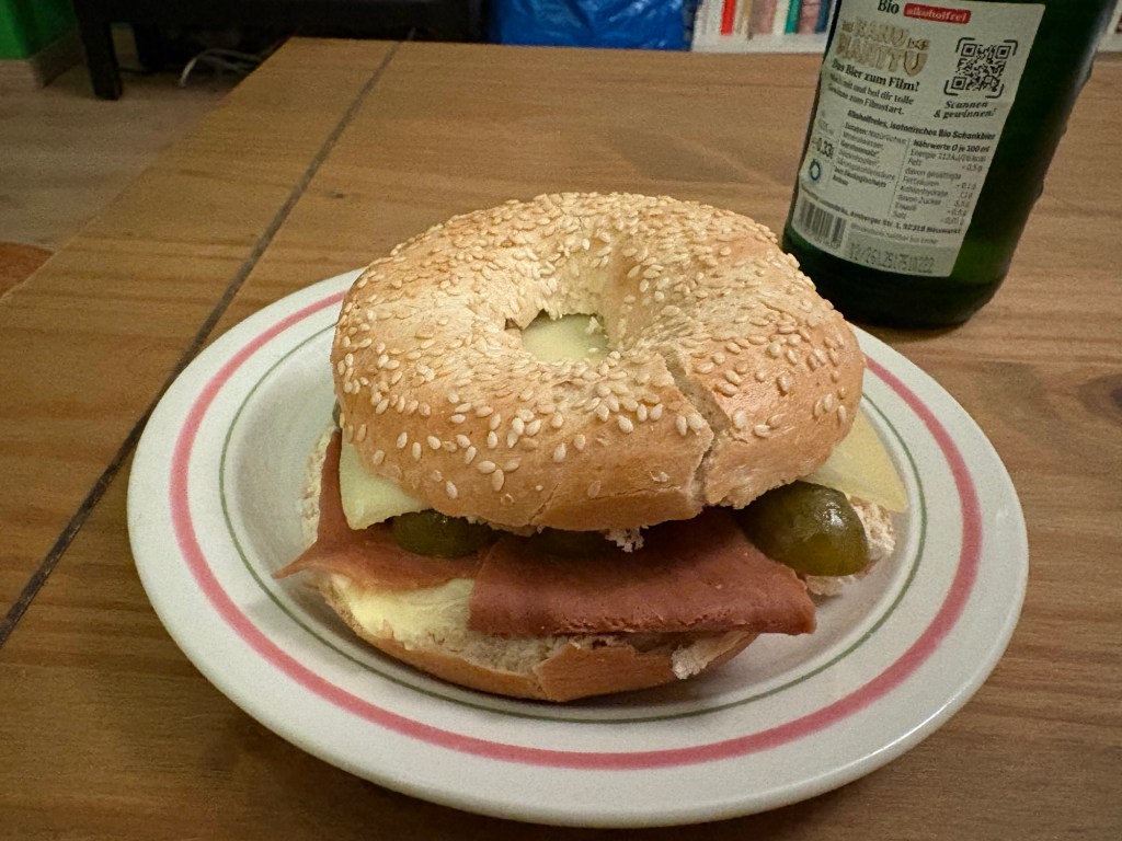 Spätes Abendbrot mit Bagel, Butter, veganem Rohschinken, Gouda, Spreewaldgurke, Apfelmeerrettich und alkoholfreiem Hellem