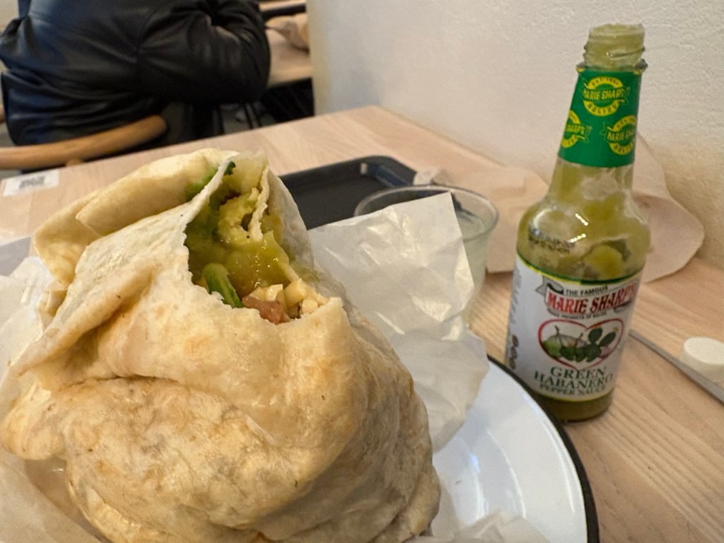 Ich gehe dann aber doch nicht mit der Gruppe essen, sondern entscheide mich für einen sonnigen Spaziergang zum Stamm-Burrito-Laden von früher, setze auf sicher gutes Essen und schnelle Füllung des nun großen Lochs im Magen. Dafür habe ich Pech mit der Bedienung, bekomme Reis statt Quinoa und der Burrito fällt beim halb Auswickeln schon ganz auseinander. Schmeckt aber trotzdem sehr gut.