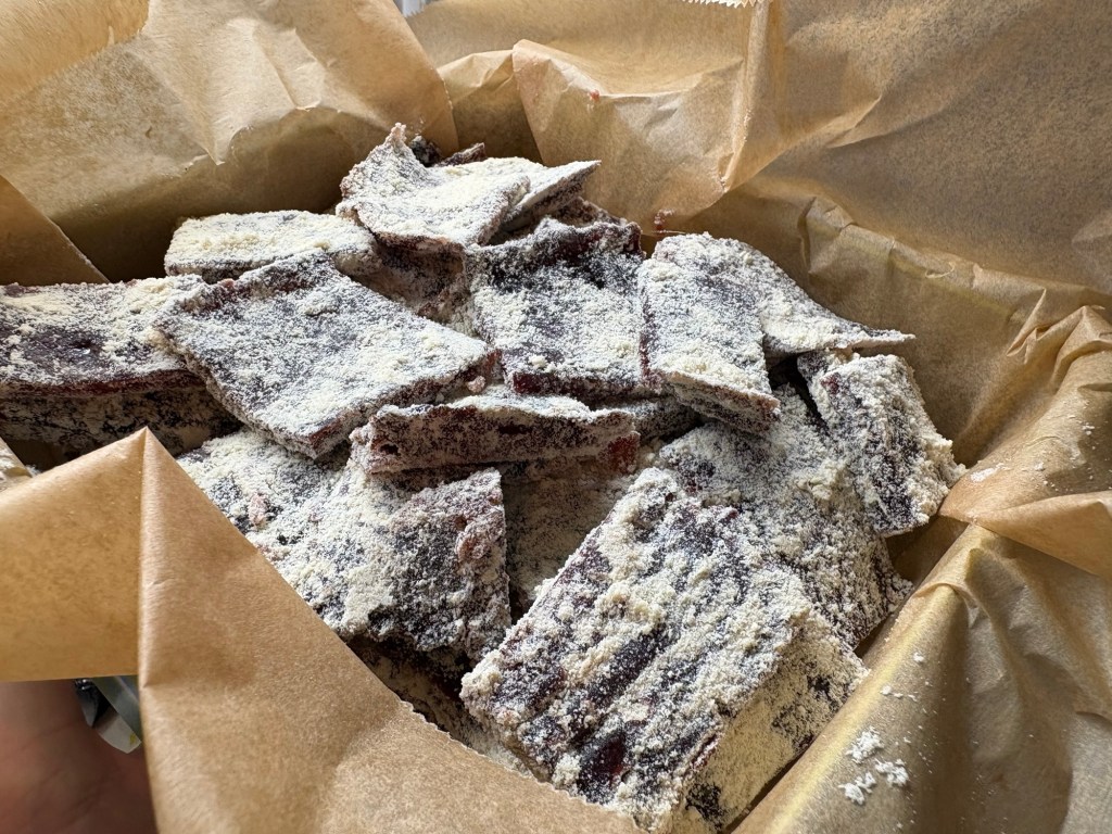 Erste Feierabendhandlung ist dann später das Schneiden des Quittenbrots, das danach in Mandelmehl gewälzt wird. Viel Mandelmehl.