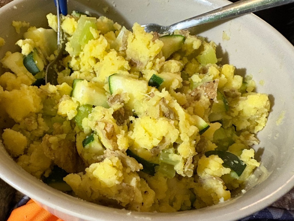 Der nächste Tee wird dann reiner Yuzu-Tee, während ich mir Abendbrot koche. Gestern schon hatte ich Lust auf Kartoffelbrei. Heute mache ich mir den und veredle mit Butter, Knoblauch, Muskat, letzter Crowdfarming-Zucchini und Sellerie.