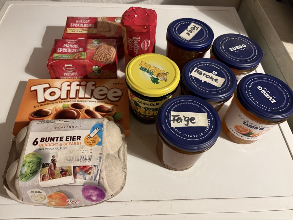 Am Nachmittag der angekündigte Besuch vom Hasen, dessen Mama mir ein Adventspäckchen schickt, das ich erfreut, gerührt und vorfreudig auspacke: Eier von den eigenen glücklichen Hühnern, zwei Sorten lokalen Spekulatius, Kekse, Toffifees und diverse Marmeladen und Brotaufstriche, diese größtenteils Fehlproduktionen (nur was die Verpackung angeht, nicht den Inhalt) aus der Fabrik, in der die Ex vom Hasenbruder arbeitet (Als der Hase nicht mein Ex war, waren wir beide noch die Schwiegertöchter der Hasenmama, jetzt sind wir beide Ex- aber gehören irgendwie weiterhin zur Familie…). Ich freue mich auf Feige, Zitrone, Bitterorange, Maronencreme und Rübensirup!