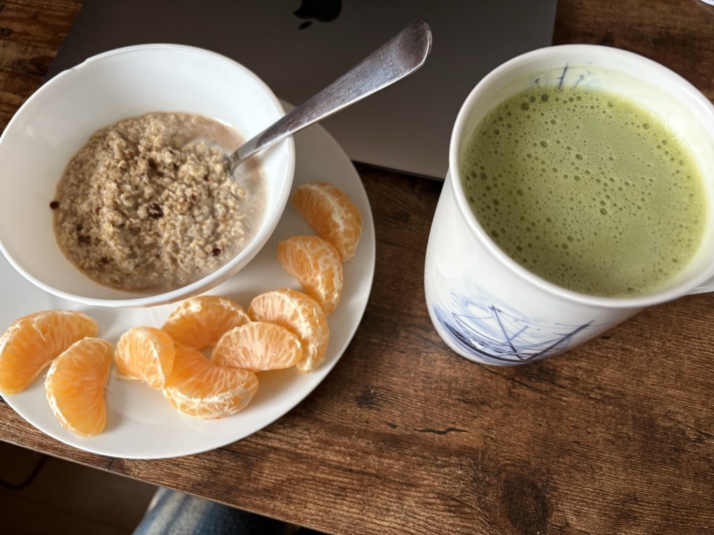 Der Porridge-Adventskalender hält heute Schoko-Banane bereit, dazu frühstücke ich eine Crowdfarming-Mandarine und Matcha mit Hafermilch. Später wechsele ich auf Yuzu-Tee.